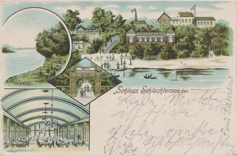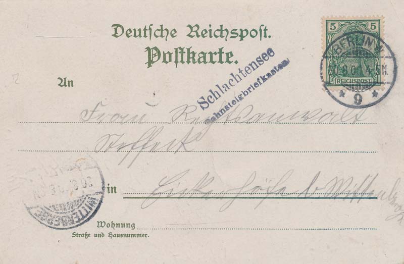 "Schlachtensee/ Bahnsteigbriefkasten" L2 auf AK "Schloss Schlachtensee" gebr. mit 5 Pf. Reichspost vom 30.8.00 nach Wittenberg |