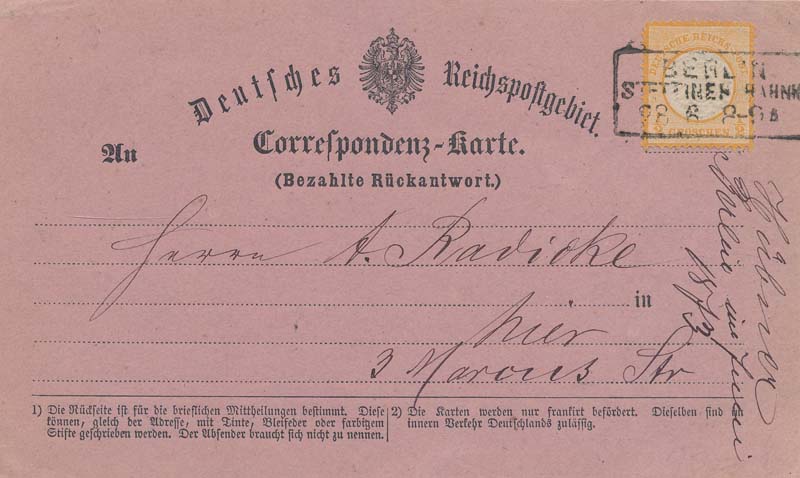 "BERLIN/STETTINER BAHNH." Ra3 in Grotesk glasklar auf DR Correspondenz-Karte (Bezahlte Rückantwort) als Ortskarte vom 28.6.(73) KBHW 105 |