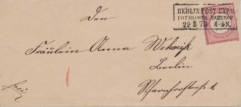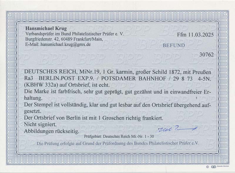 "BERLIN. POST-EXP.9./POTSDAMER BAHNHOF" Ra3 in schwarz vom 29.8.73 glasklar auf Bf. mit DR 1 Gr. gr. Schild als Ortsbf. Laut neuen Befund Krug "echt u. einwandfrei KBHW 332a" der 332a war aber nur zur Preussenzeit in Betrieb, Maße des Stpl. 38,5x15 wäre also dann der KBHW 334b! u. laut KBHW auf frankierten Bf. beim DR sehr selten! u. mit L.P. bewertet!! |