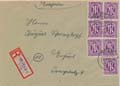 6 Pf. AM-Post am. Druck "z"-Papier als MeF von 7 St. (dabei 6er Block) auf R-Bf. ab Passau vom 17.1.46 nach Fredersdorf |