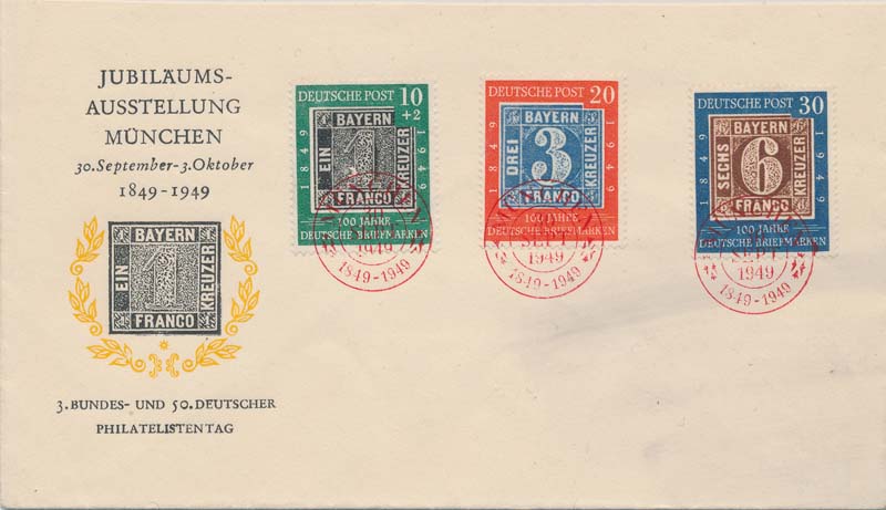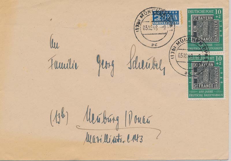 10 Pf. 100 Jahre dt. Briefmarken im als MeF auf Bf. ab München vom 3.10.49 nach Neuburg, Umschlag Randtönung |