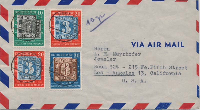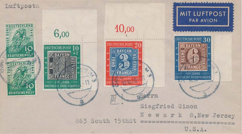 10, 20(2) u. 30 Pf. 100 Jahre dt. Briefmarken zusammen auf Lp-Überseebf. ab Passau vom 1.10.49 in die USA |
