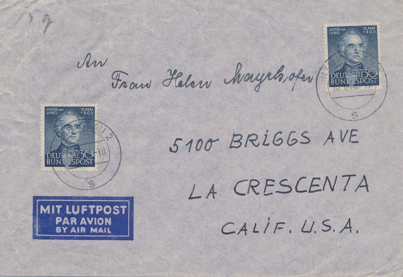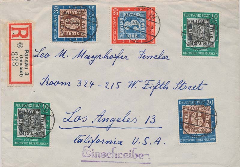 10(2), 20 u. 2 mal 30 Pf. 100 Jahre dt. Briefmarken zusammen auf R-Überseebf. ab Passau vom 5.10.49 in die USA |