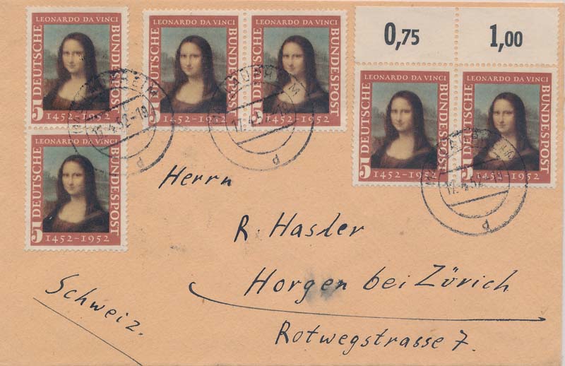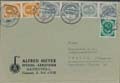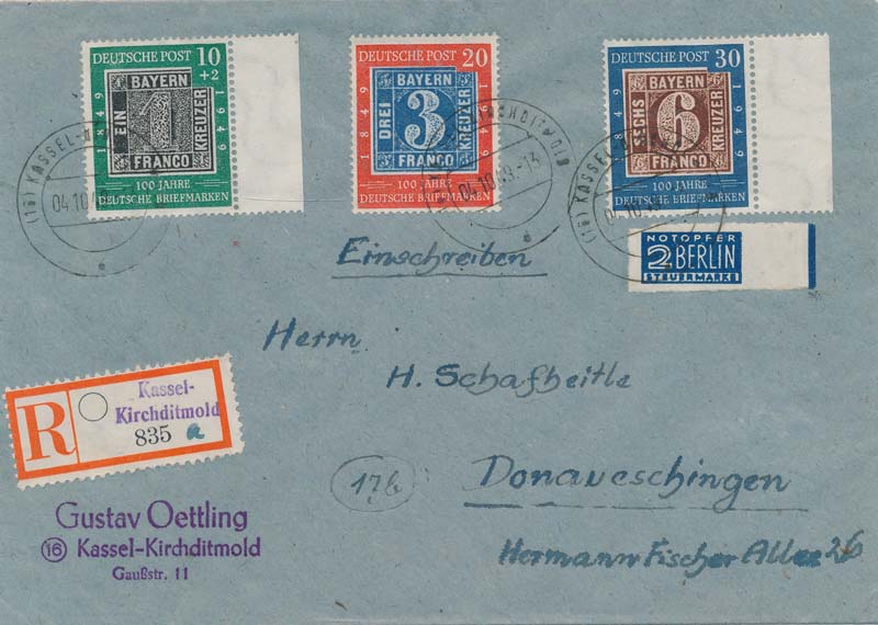 100 Jahre dt. Briefmarken kpl. auf R-Bf. ab Kassel vom 4.10.49 nach Donaueschingen, dabei 10 Pf. mit Plattenfehler III "Retusche von Plattenfehler I" |