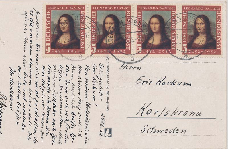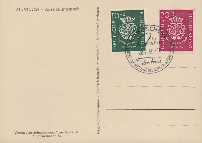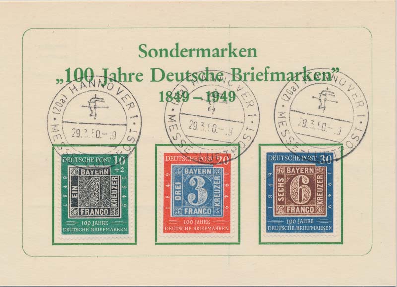100 Jahre dt. Briefmarken kpl. auf So-Karte mit SST vom 29.3.50 |