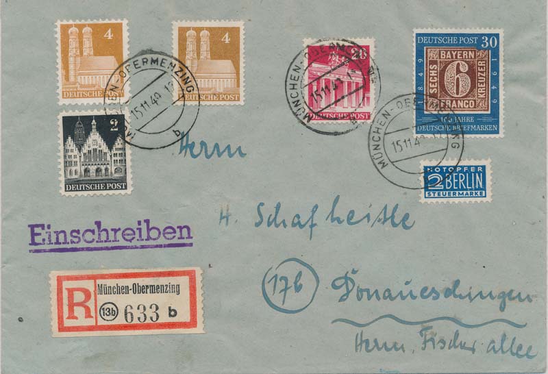 30 Pf. 100 Jahre dt. Briefmarken in MiF mit Bizone 2, 4(2) u. 20 Pf. Bauten zusammen auf R-Bf. ab München-Obermenzing vom 15.11.49 nach Donaueschingen |