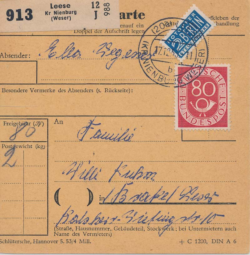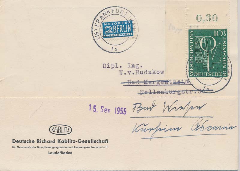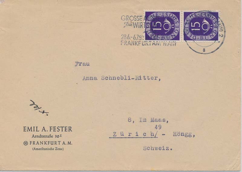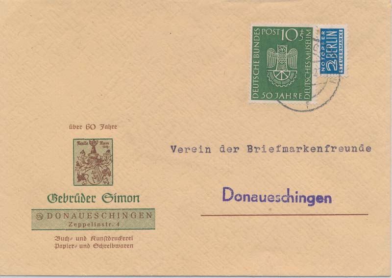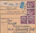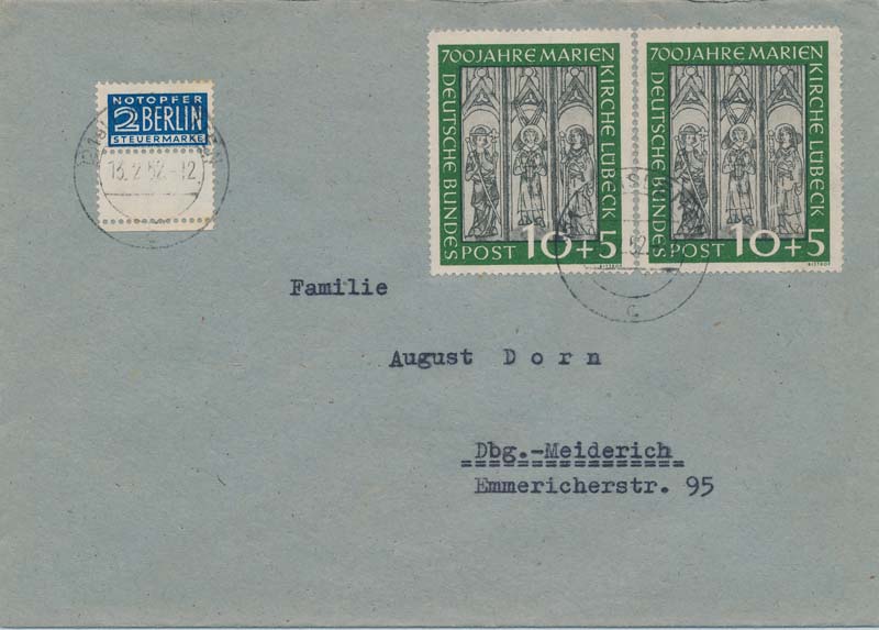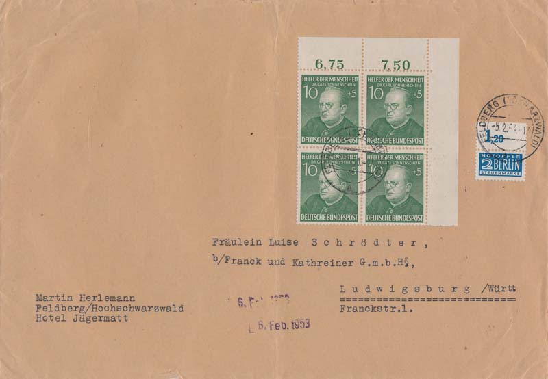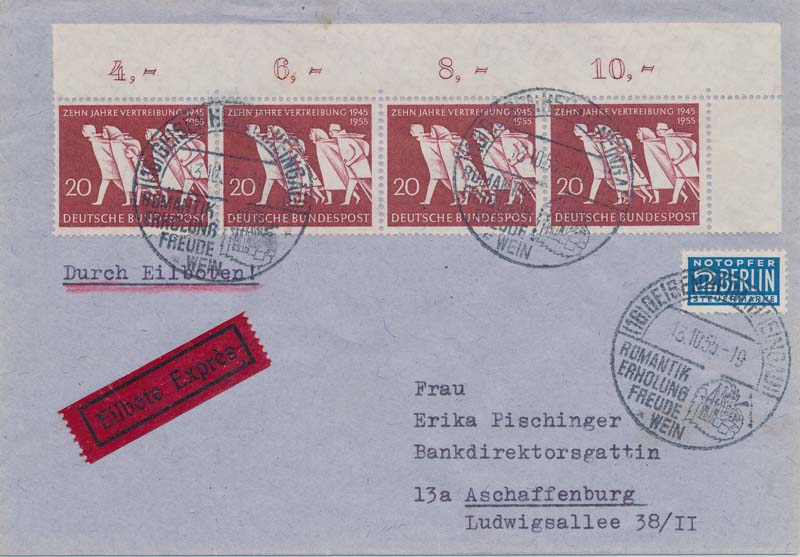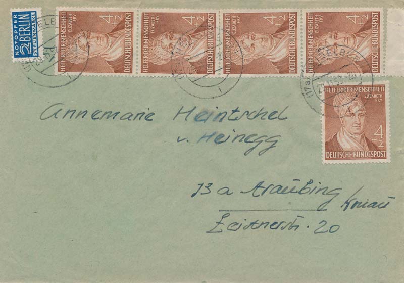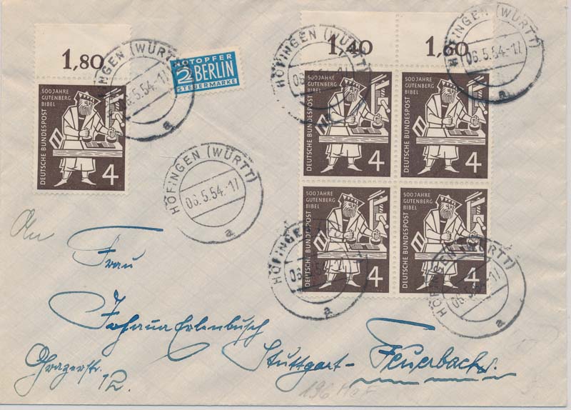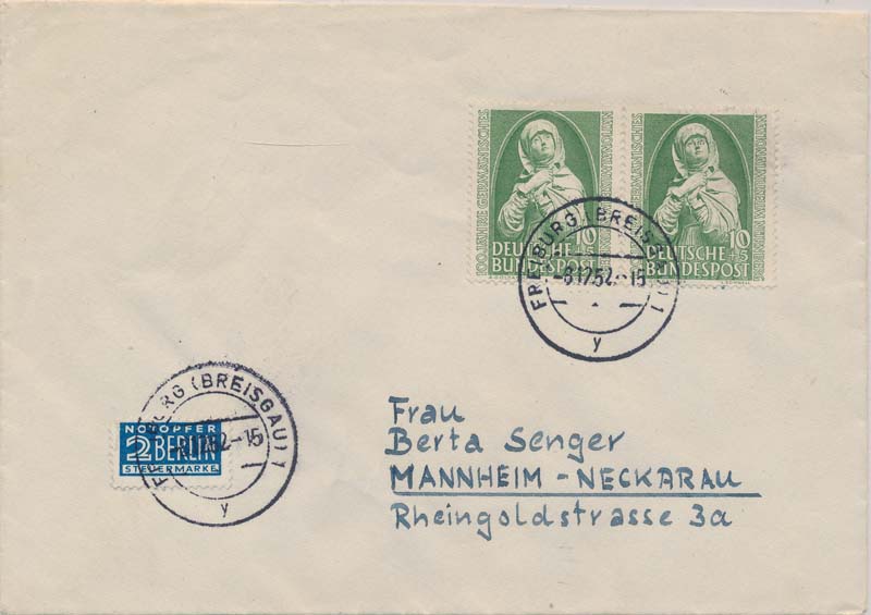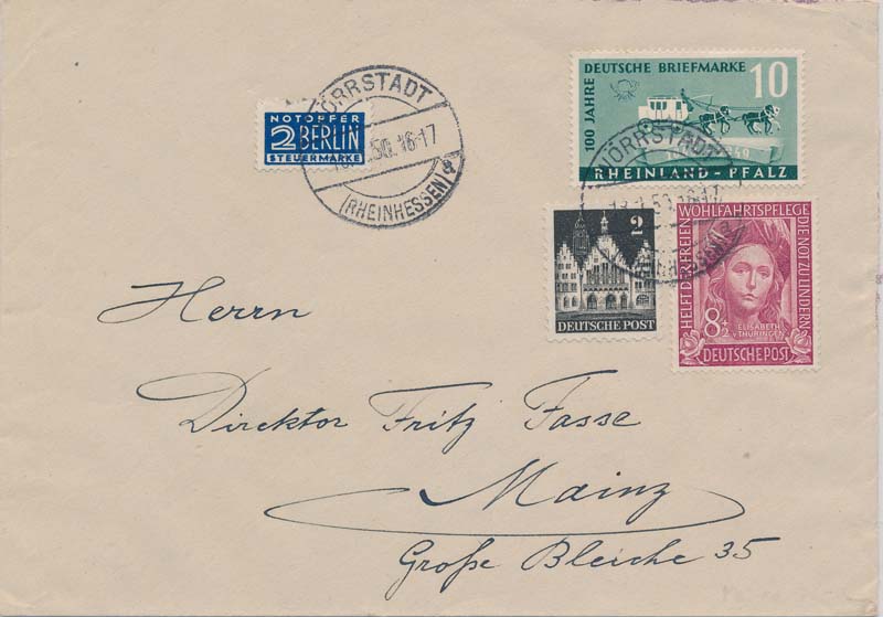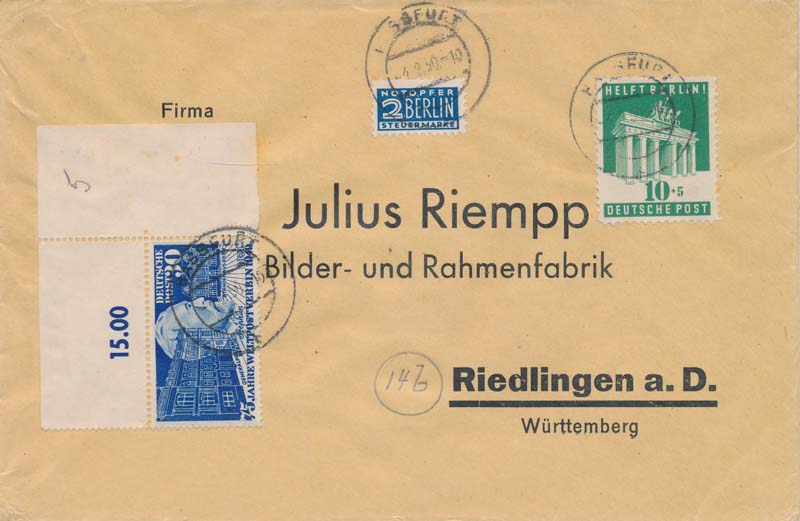Stephan r. obere Bogenecke u. Bizone 10 Pf. Berlin-Hilfe zusammen auf Doppelbf. ab Hassfurt vom 4.2.50 nach Riedlingen |