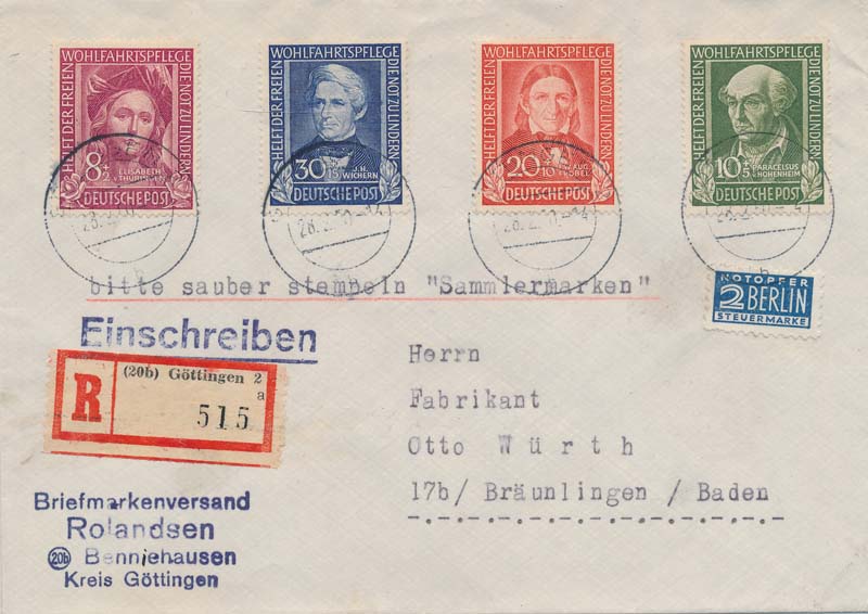 Wohlfahrt 1949 kpl. auf Sammler R-Bf. ab Göttingen v. 28.2.50 nach Bräunlingen |