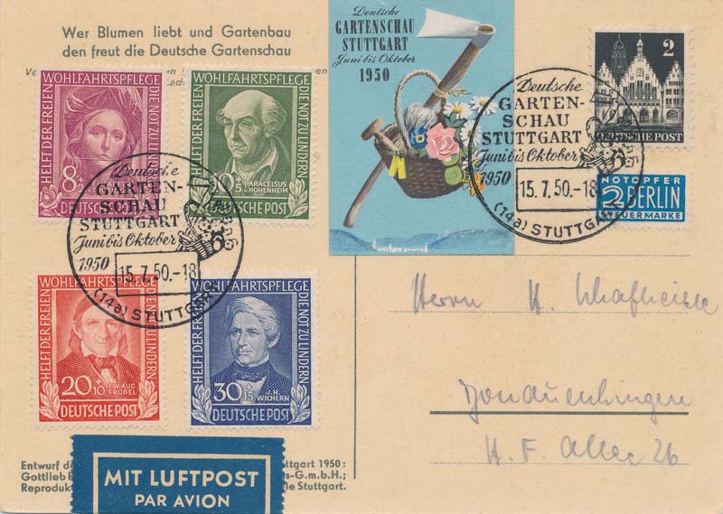 Wohlfahrt 1949 kpl. mit 2 Pf. Bauten auf Lp-Karte mit SST vom 15.7.50 ab Stuttgart nach Donaueschingen |