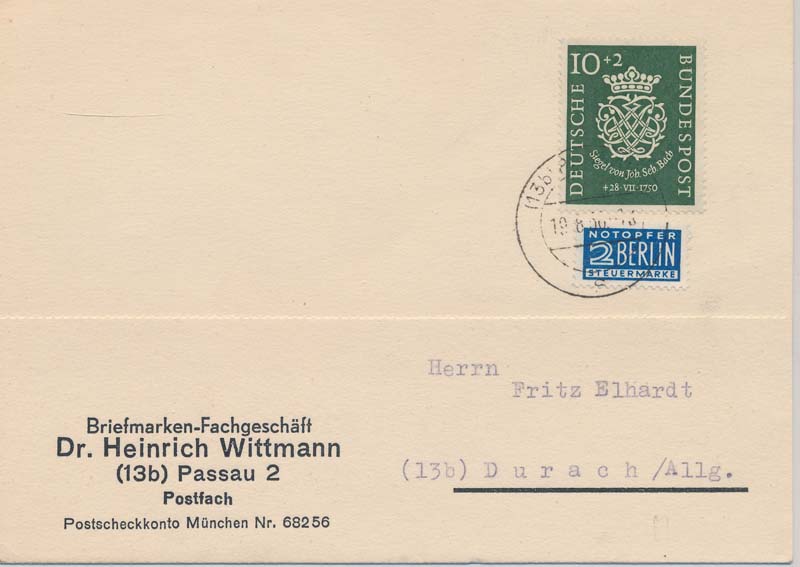 10 Pf. Bach als EF auf Pk ab Passau vom 19.8.50 nach Durach |