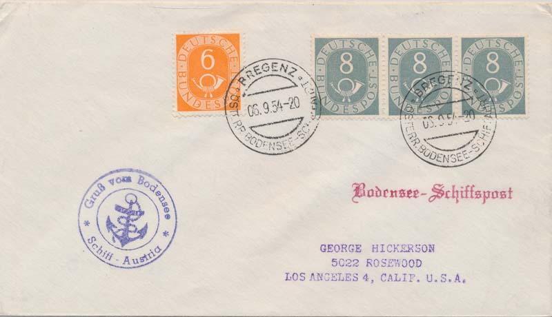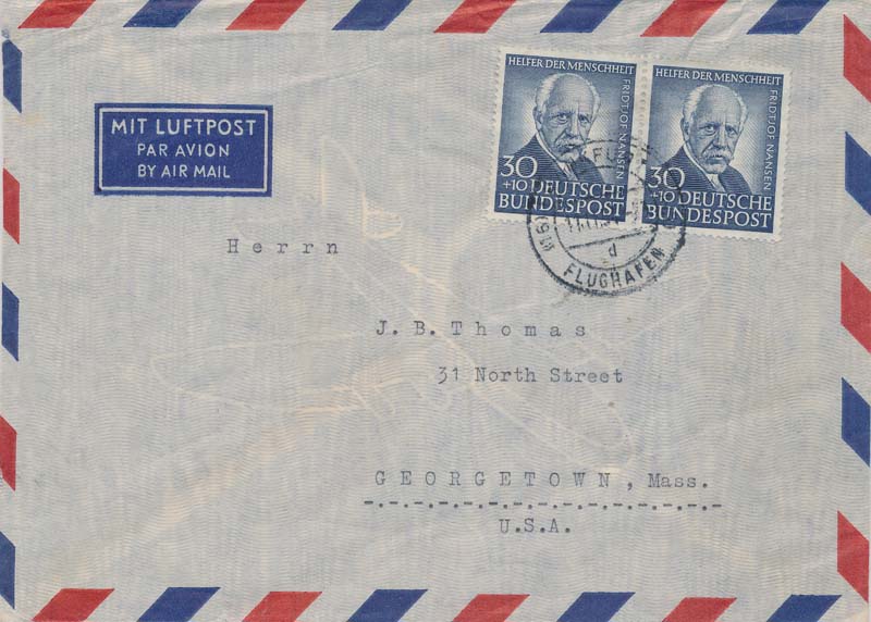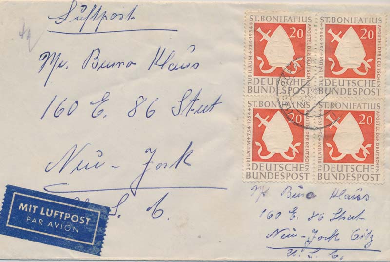 Stephan 2 St. zusammen mit Fr. Zone Rheinland Pfalz 20 Pf. UPU auf Lp-Überseebf. ab Passau vom 8.11.49 in die USA |