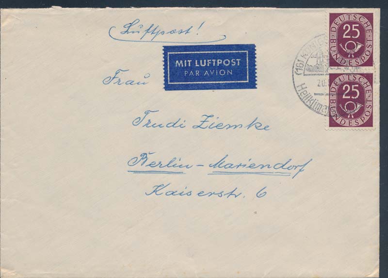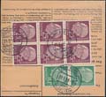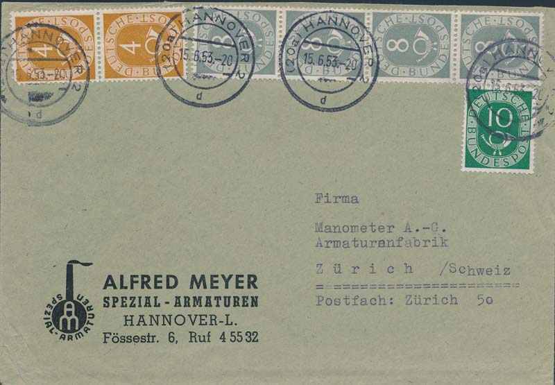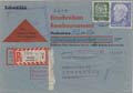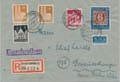 8+Z+1 Pf. Heuss/Ziffer im waager. Streifen mit 20+8+20 Pf. Heuss im senkr. Streifen sowie 5+10 Pf. Heuss zusammen auf R-Bf. ab Berlin-Tempelhof vom 4.2.59 nach Passau |