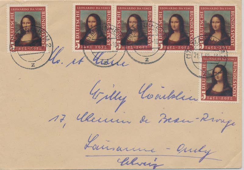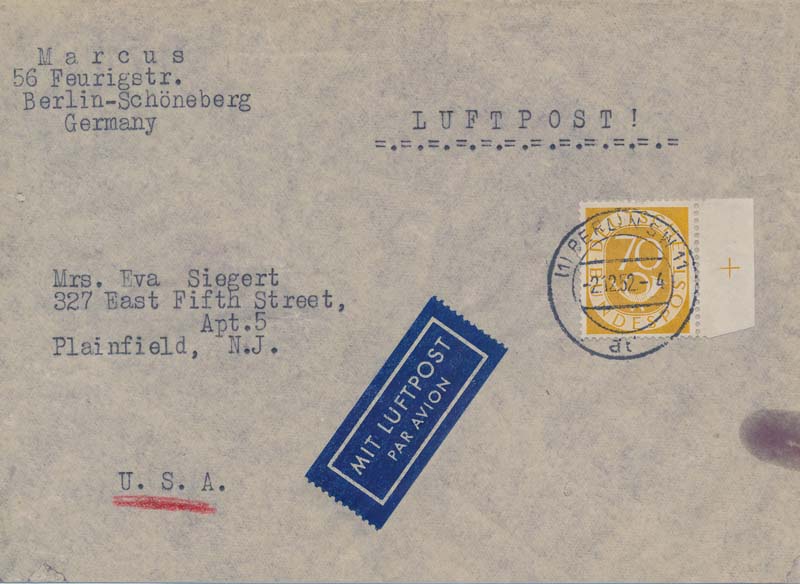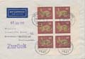 30 Pf. 100 Jahre dt. Briefmarken im l. obere Bogenecke als MeF auf Lp-R-Überseebf. ab Traben-Trarbach vom 5.5.50 in die USA. Dabei r. untere Marke mit Plattenfehler III! Umschlag kl. Einriß aber sehr seltene MeF-Variante u. hier noch mit Bogenecke u. Plattenfehler !! |