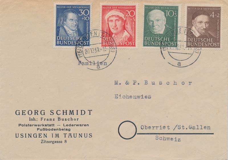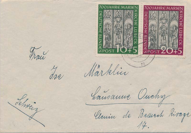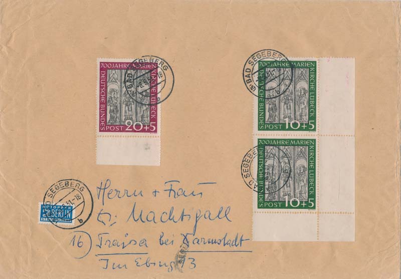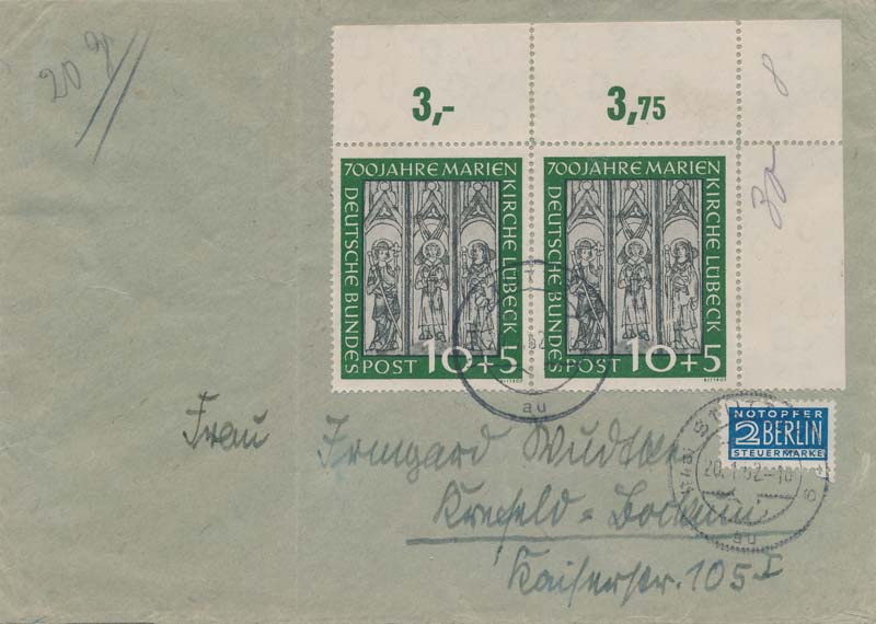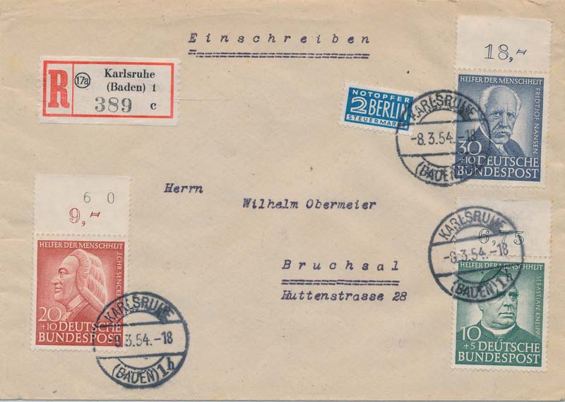 20 u. 2 mal 30 Pf. Wohlfahrt 1949 zusammen auf R-Doppelbf. ab Schwäbisch Gmünd vom 27.1.50 nach Donaueschingen, Umschlag kl. Ecke abgeschnitten |