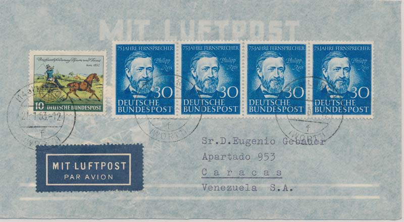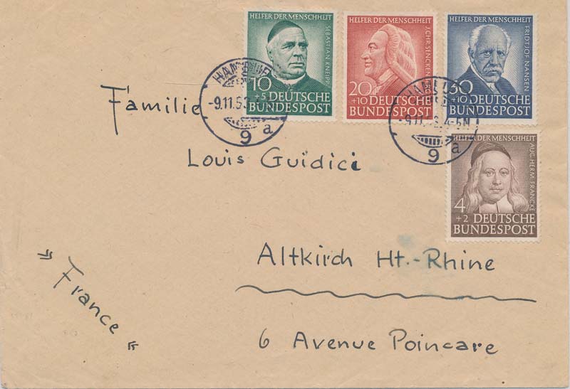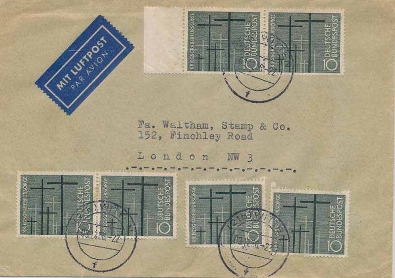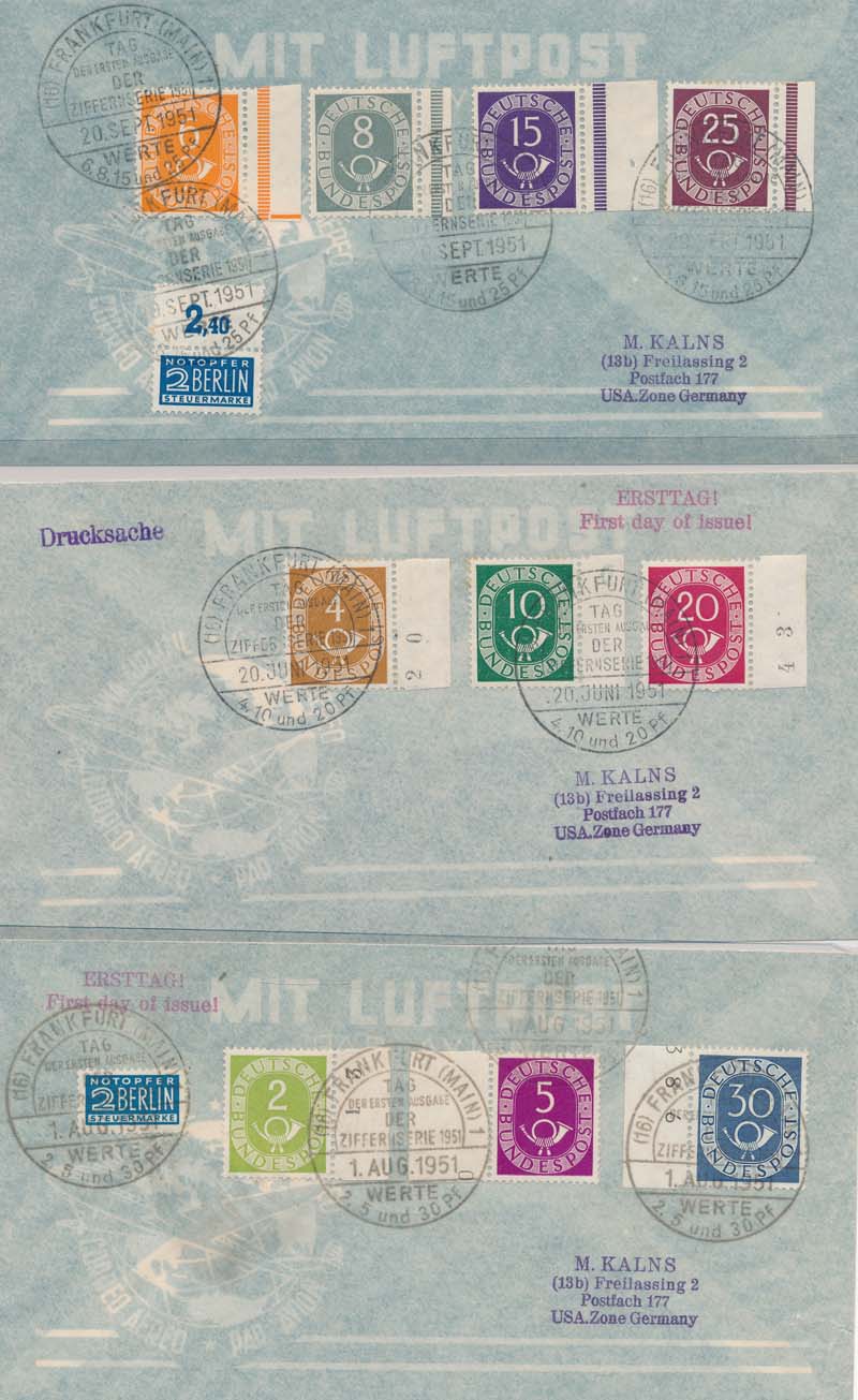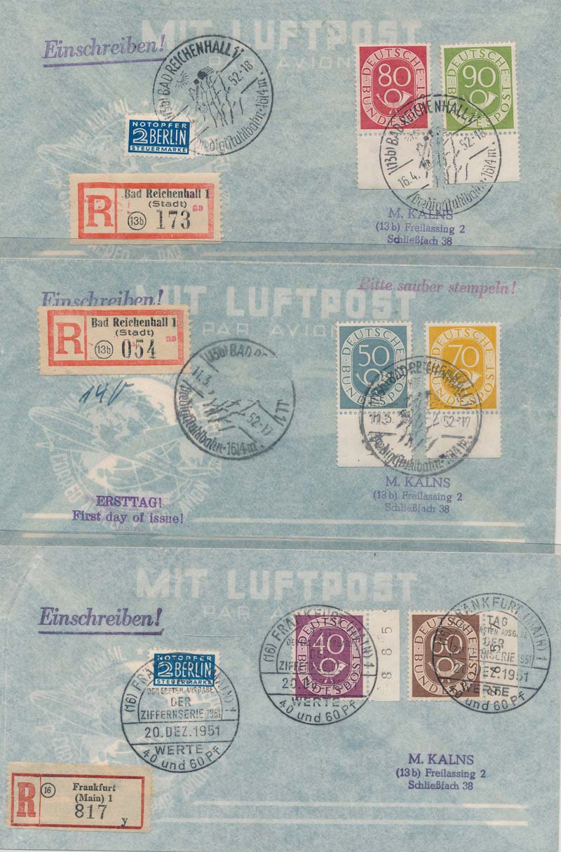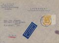 100 Jahre dt. Briefmarken kpl. Satz sowie Bizone 10 Pf. Radfahrer zusammen auf Lp-Überseebf. ab Hildesheim vom 17.10.49 in die USA, dabei 10 u. 20 Pf. je r. obere Bogenecke! u. die 20 Pf. mit Plattenfehler III ! |