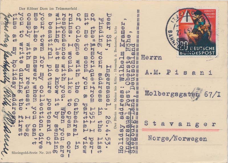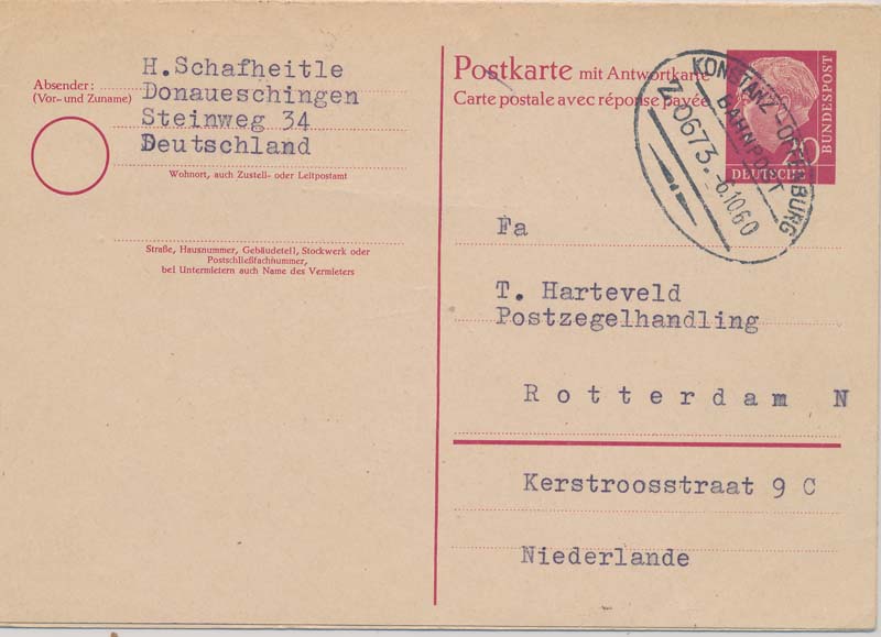 20 Pf. Heuss Ausg. Doppelkarte gebr. mit BP-Stpl. vom 6.10.60 in die Niederlande u. von dort ab Rotterdam vom 7.10.60 nach Donaueschingen, beide Karten viel Text! |