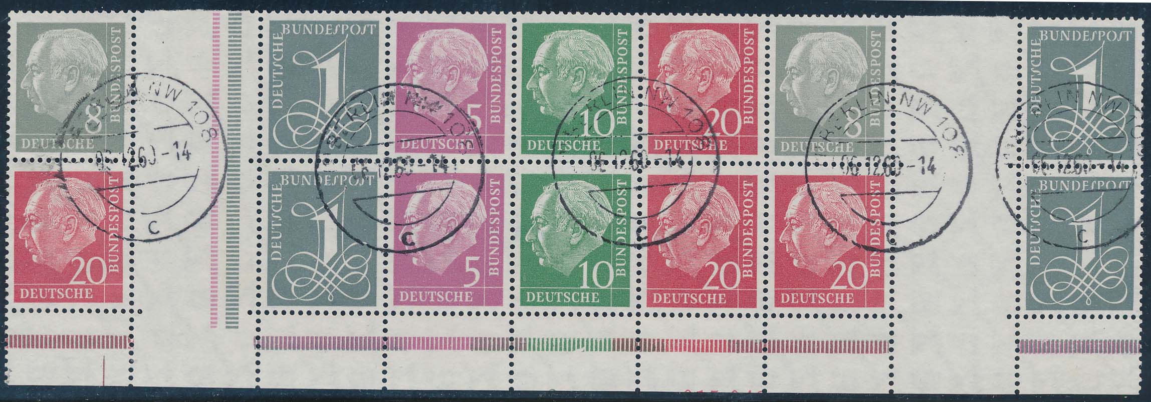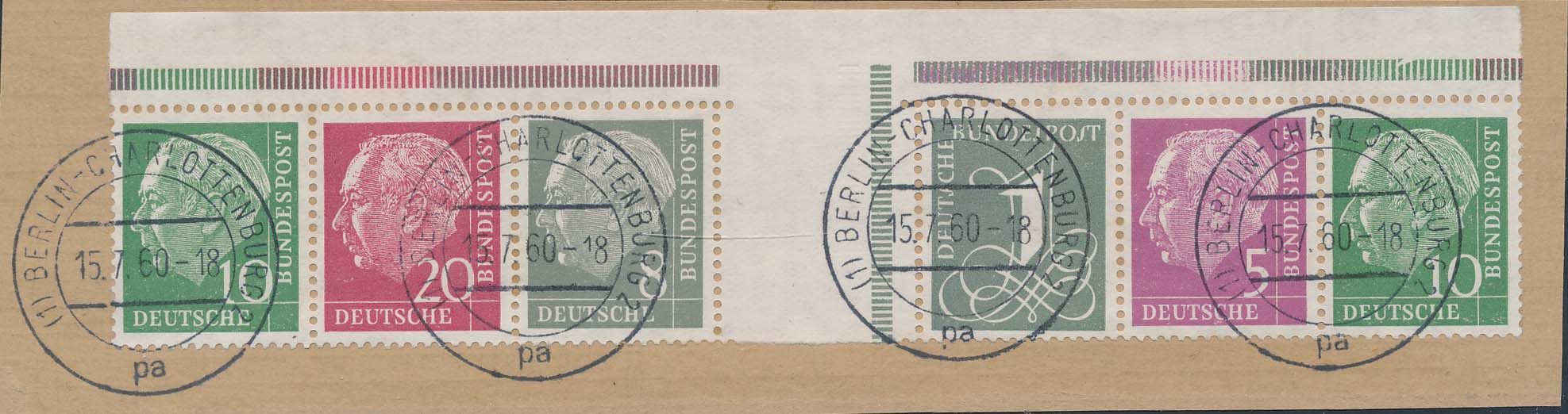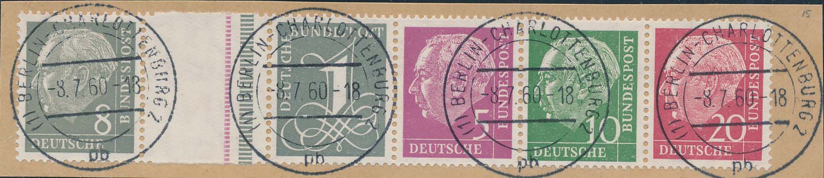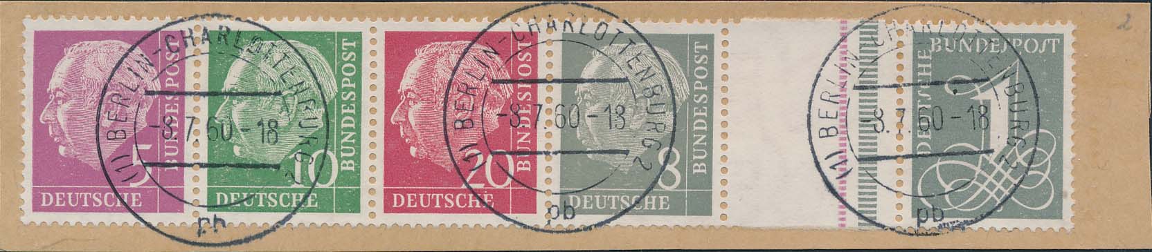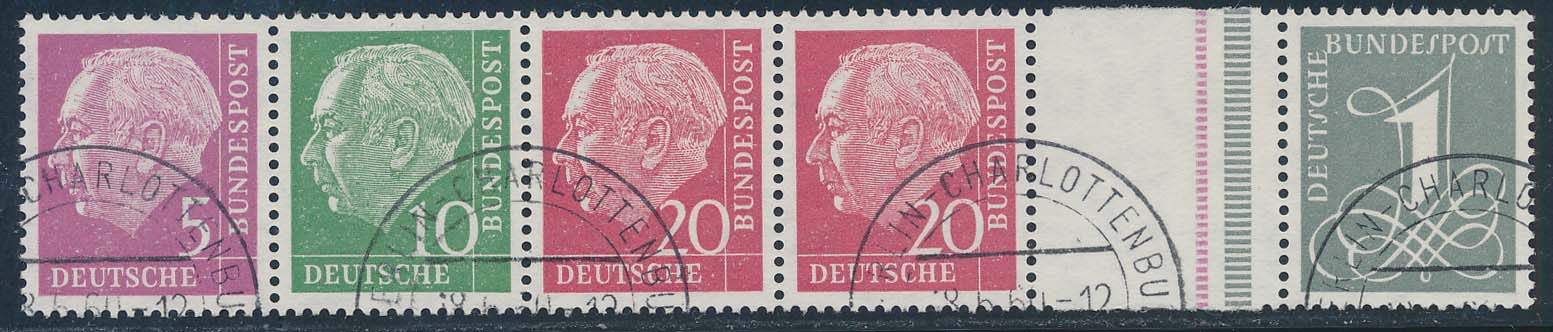 8+Z+1+5+10+20 Pf. Heuss WZ "Y" Typ I im waager. Streifen ideal gestpl. "BERLIN-CHARLOTTENBURG 2" LUXUS! auf Bf.-St. Fotoattest Schlegel D. "echt u. einwandfrei" |