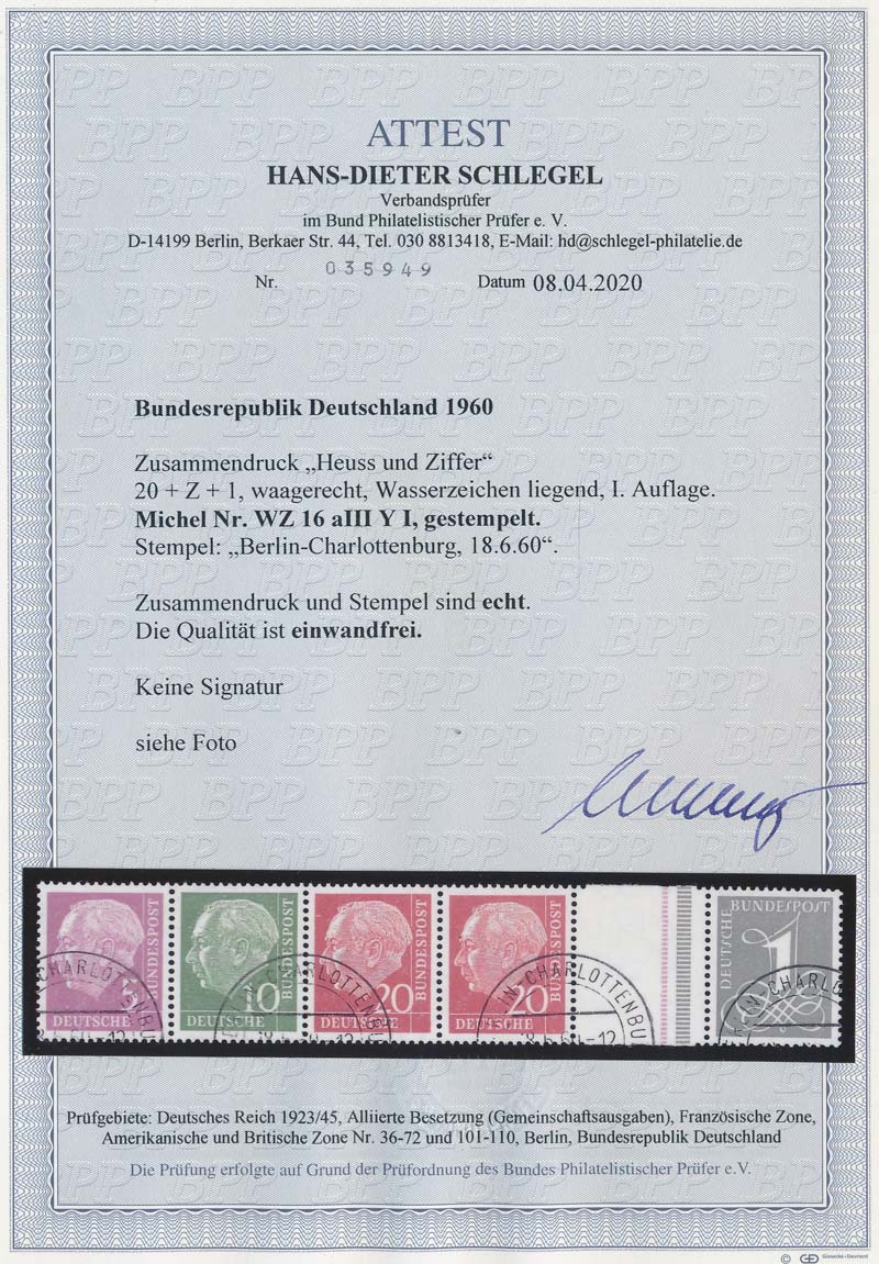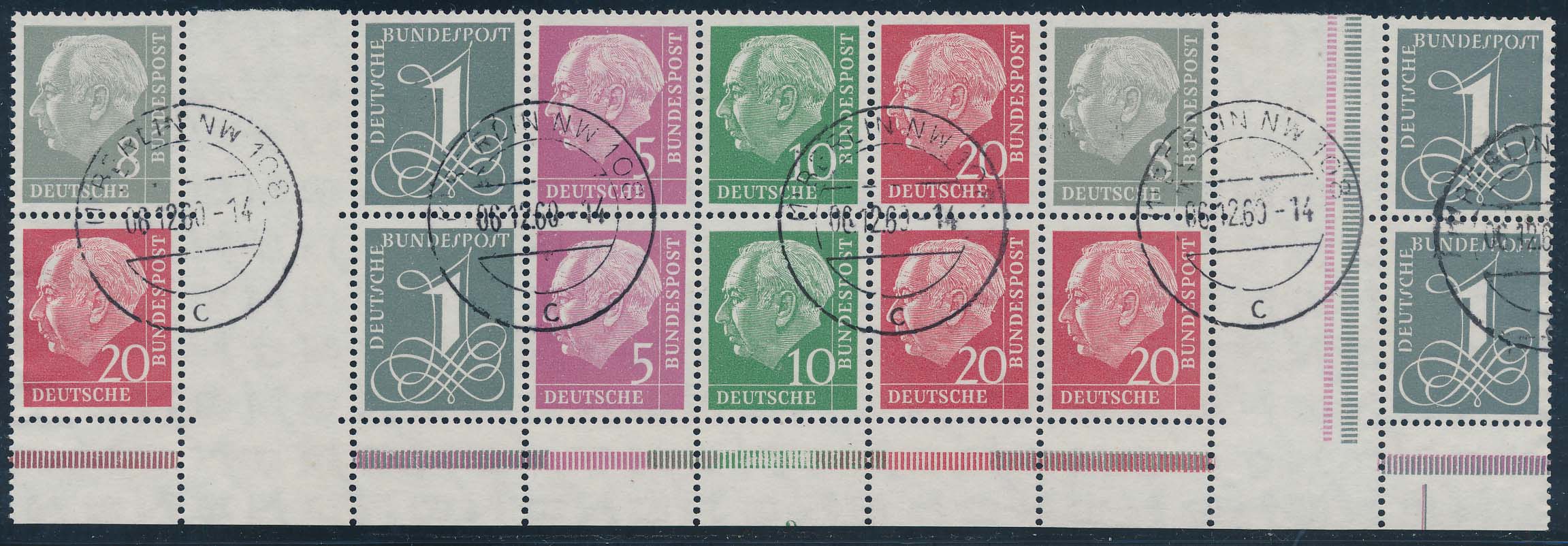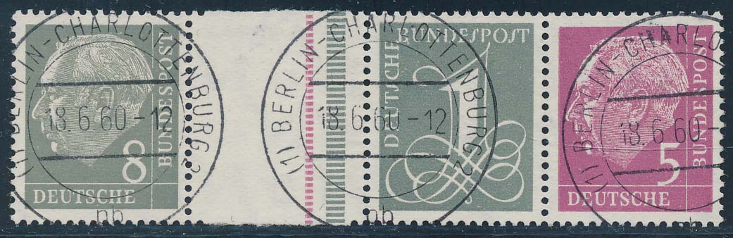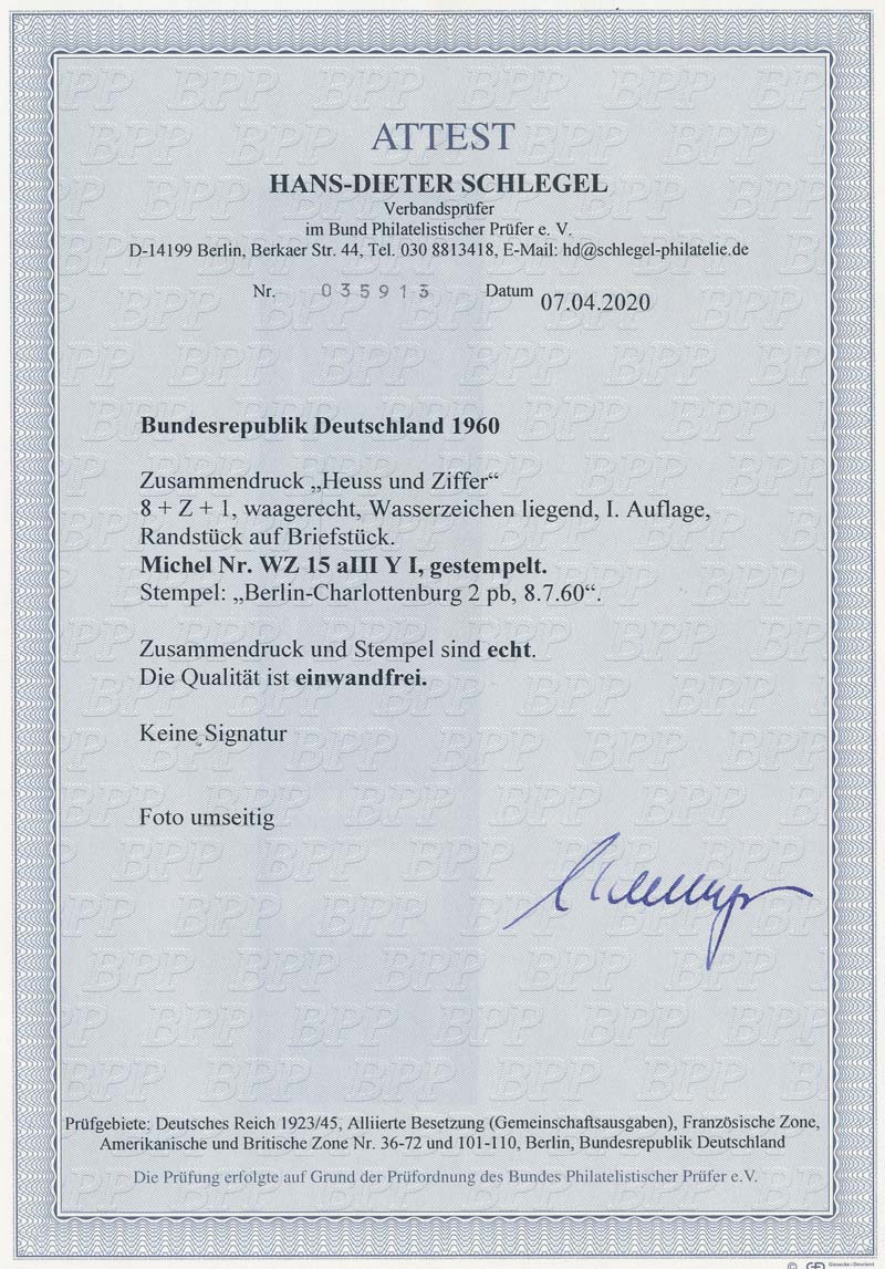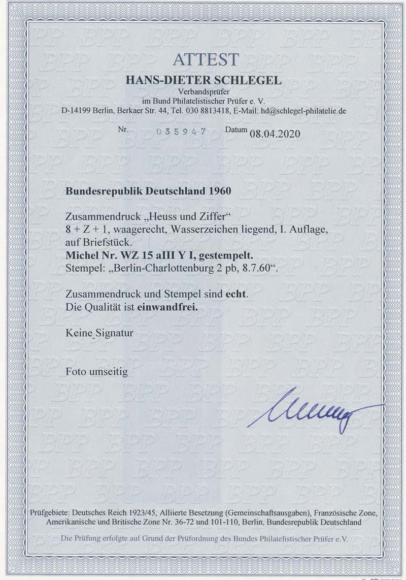 8+Z+1+5+10+20 Pf. Heuss WZ "Y" Typ I im waager. Streifen ideal gestpl. "BERLIN-CHARLOTTENBURG 2" LUXUS! auf Bf.-St. Fotoattest Schlegel D. "echt u. einwandfrei" |