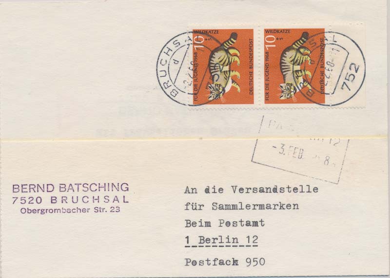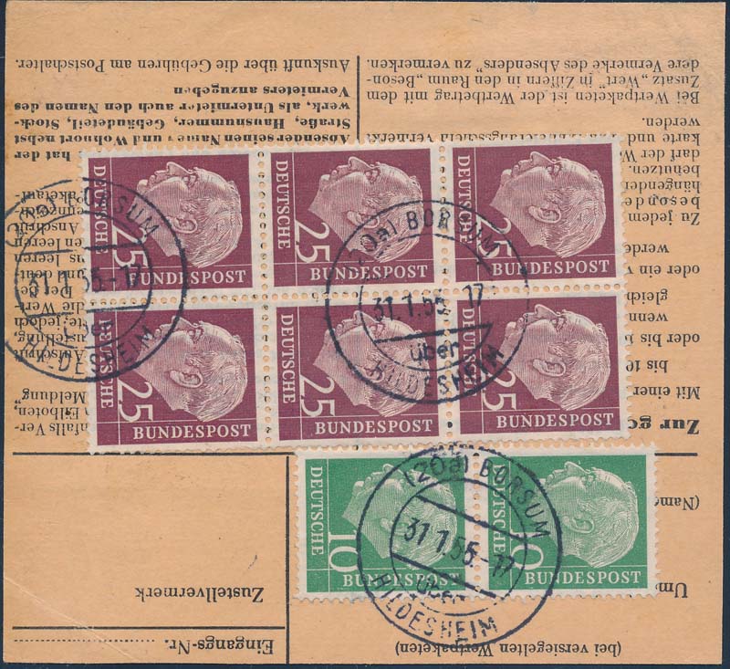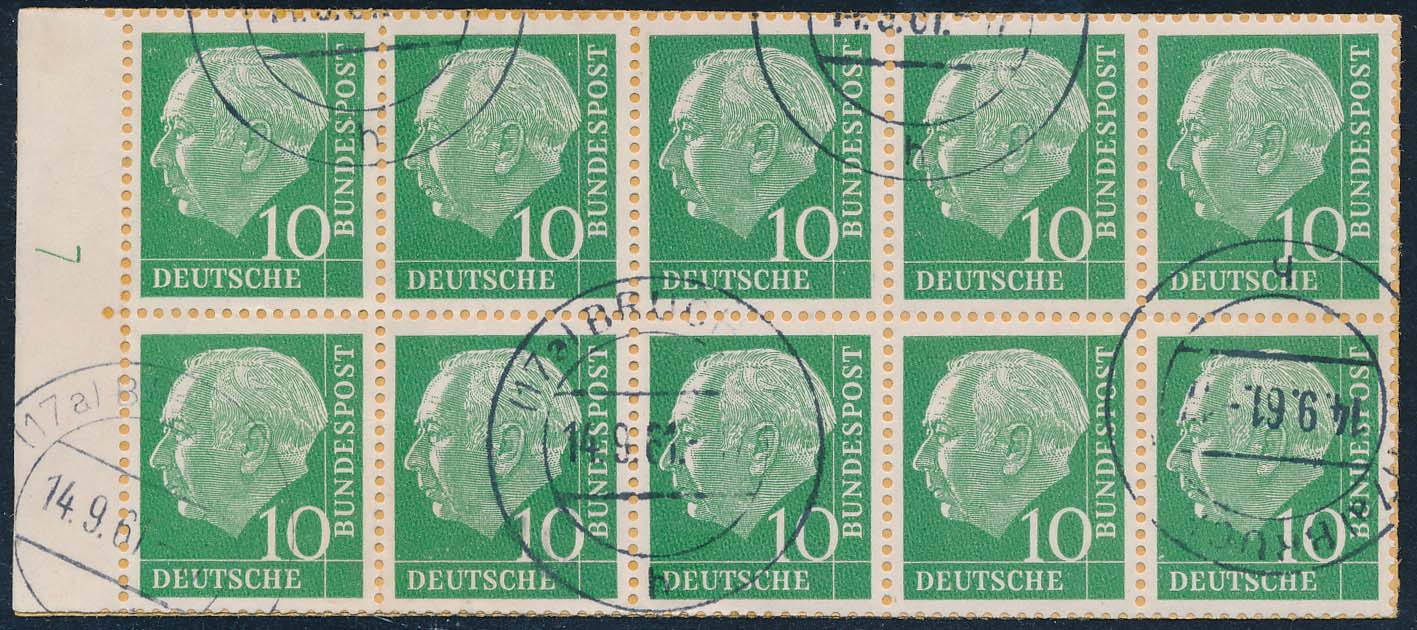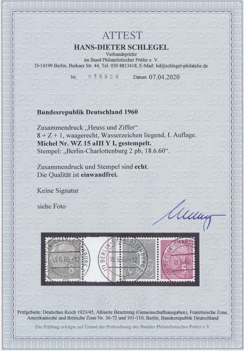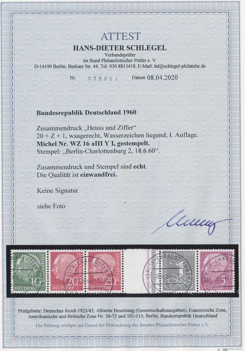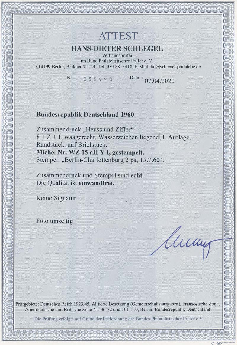 8+Z+1+5+10+20 Pf. Heuss WZ "Y" Typ I im waager. Streifen ideal gestpl. "BERLIN-CHARLOTTENBURG 2" LUXUS! auf Bf.-St. Fotoattest Schlegel D. "echt u. einwandfrei" |
