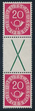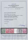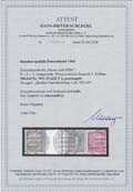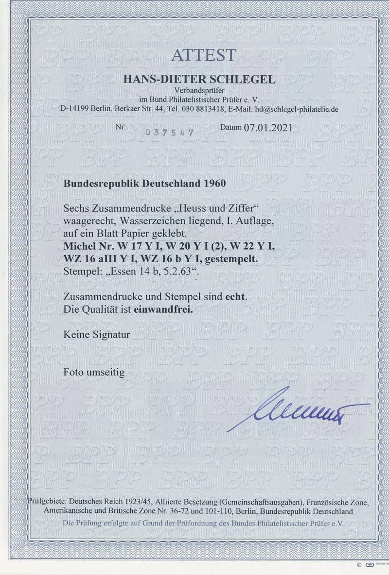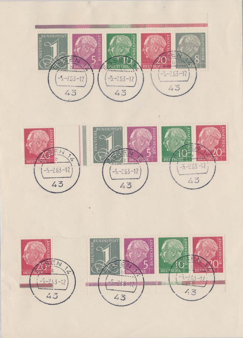 20+Z+1+5+10+20 Pf. Heuss 2 waager. Streifen mit unterschiedlichen Zwischensteg sowie 1+5+10+20+8 Pf. Heuss zusammen auf Blatt Papier sauber gestpl. Fotoattest Schlegel D. "echt u. einwandfrei" |
