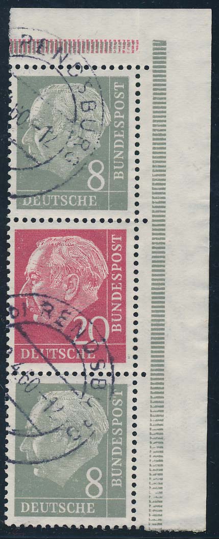 8+20+8 Pf. Heuss WZ "Y" Typ I im senkr. 3er Streifen r. obere Bogenecke (senkr. vorgefaltet) Pracht gepr. Schlegel. Der einzige gestpl. Heuss-ZD ohne Preis im Michel! |