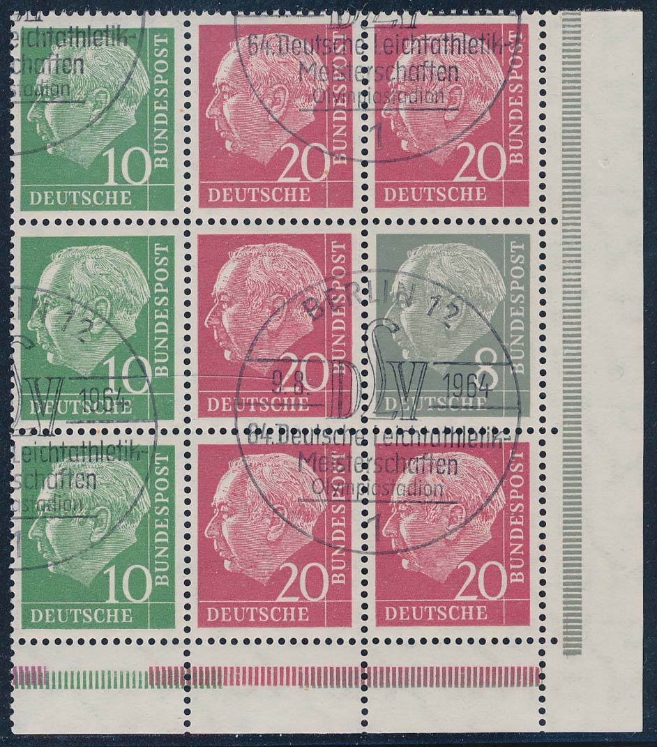 20+8+20 Pf. Heuss WZ "Y" Typ I mit 3 weiteren 10+20 Pf. Heuss als Blockstück r. untere Bogenecke ideal gestpl. "BERLIN Dt. Leichtathletik-Meisterschaften" mit vollem Orginalgummi! LUXUS! gepr. Schlegel D. |