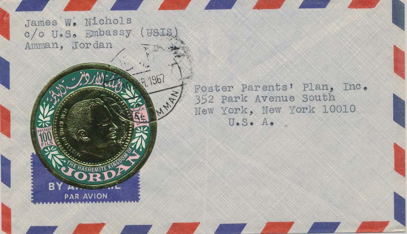 100 F. König Hussein als EF auf Lp-Überseebf. ab Amman vom 16.4.67 in die USA Umschlag Faltbug |