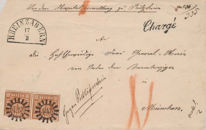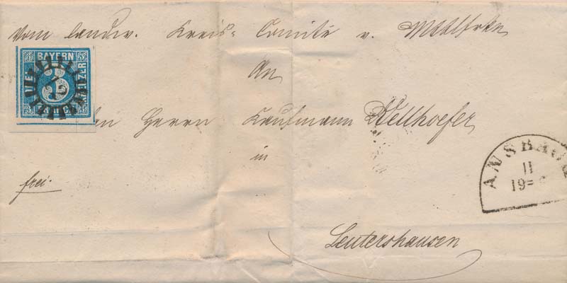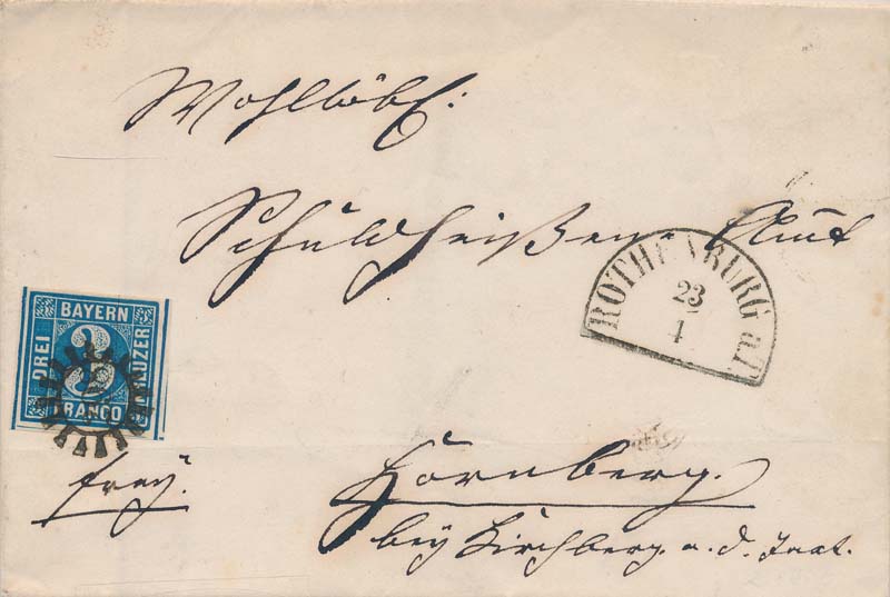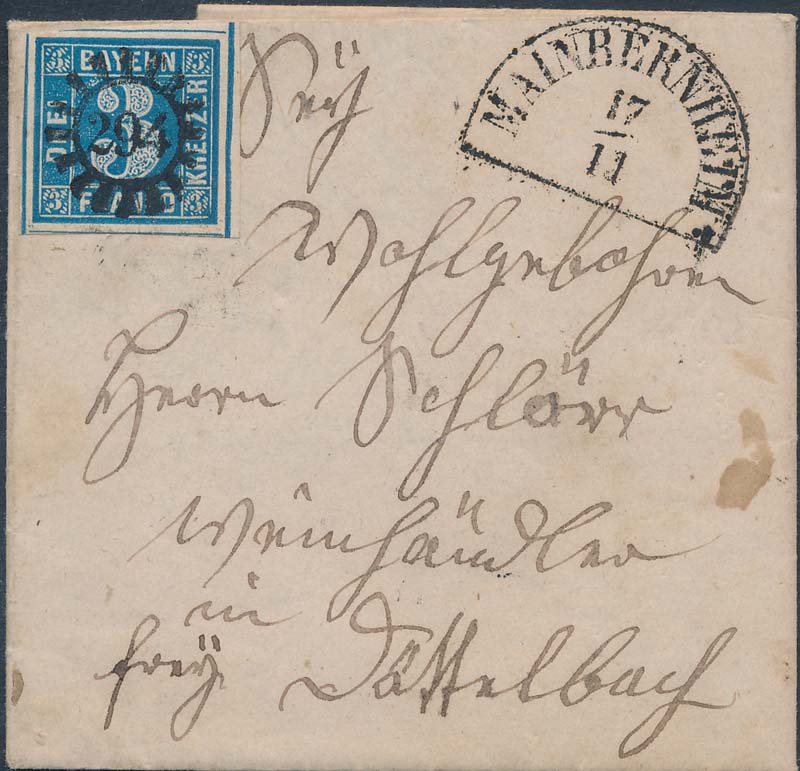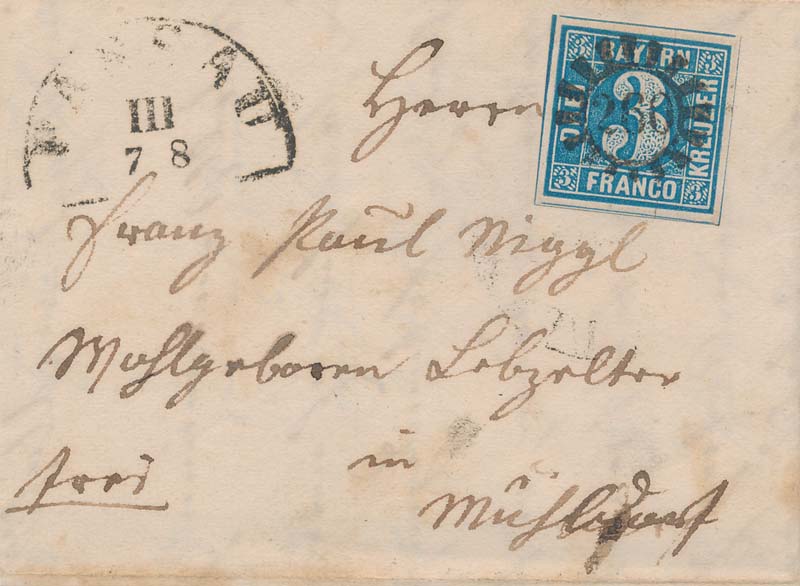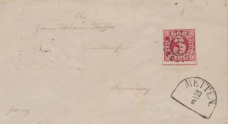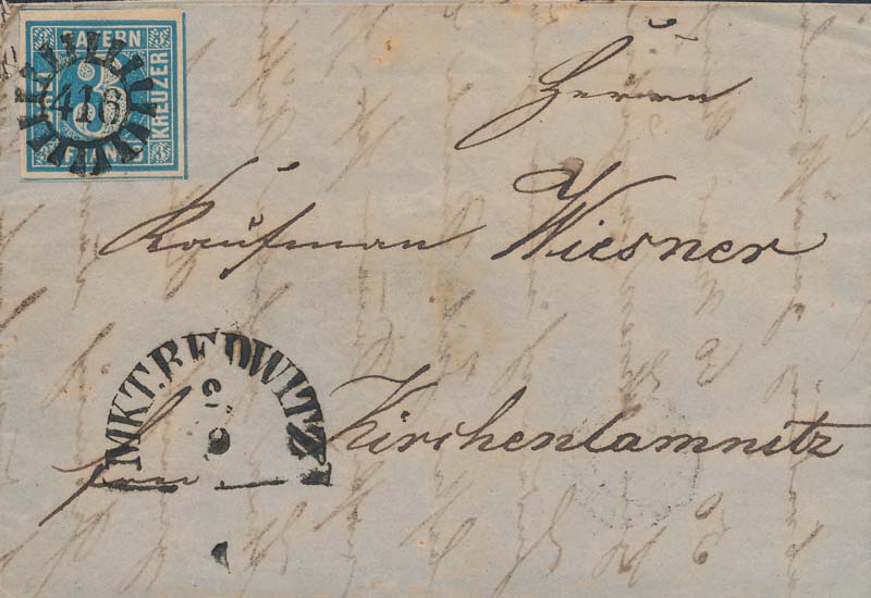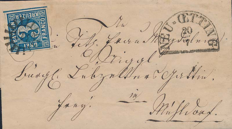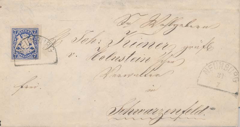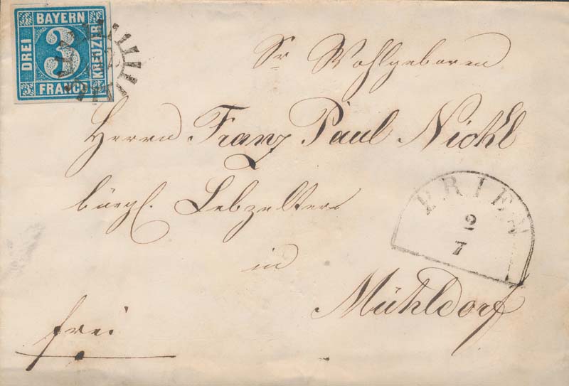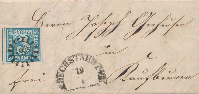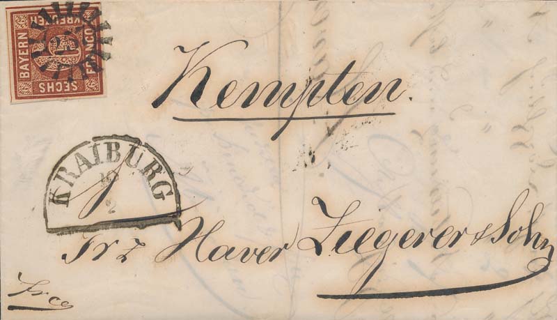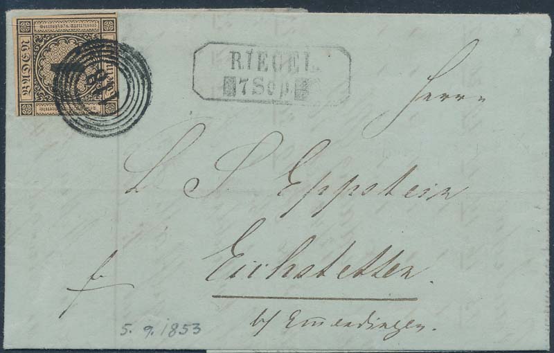 1 Kr. Ziffer Ausg. 1851 "b"-Farbe 3seitig voll bis überrandig (l. angeschnitten) als EF auf Bf. mit Nr.-Stpl. "118" u. nebenges. Ra2 "RIEGEL" nach Eichstetten, sehr saubere Erhaltung |
