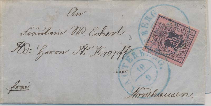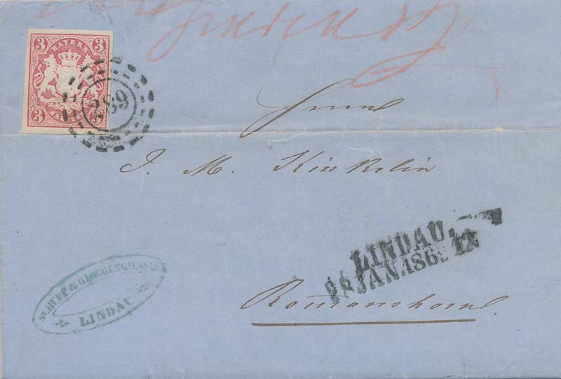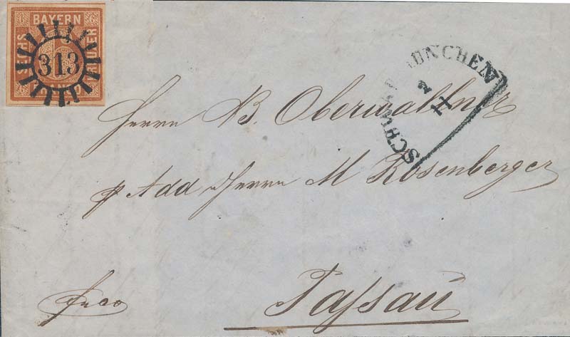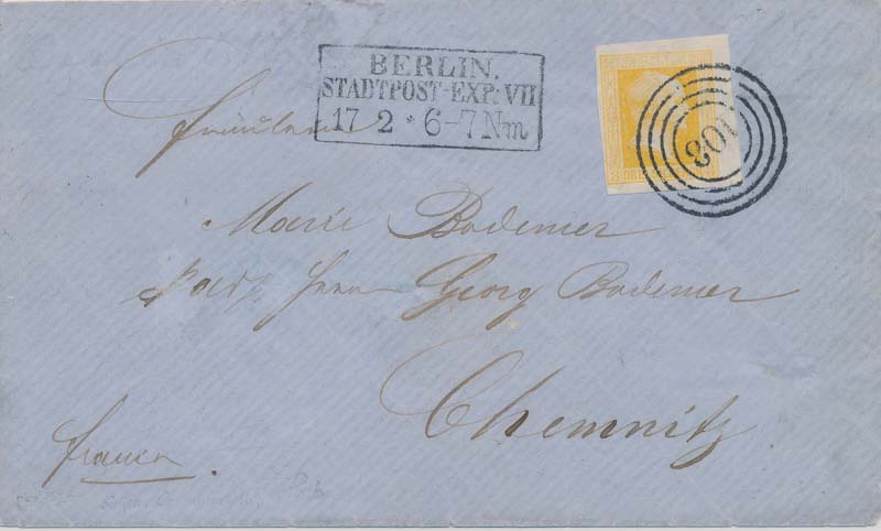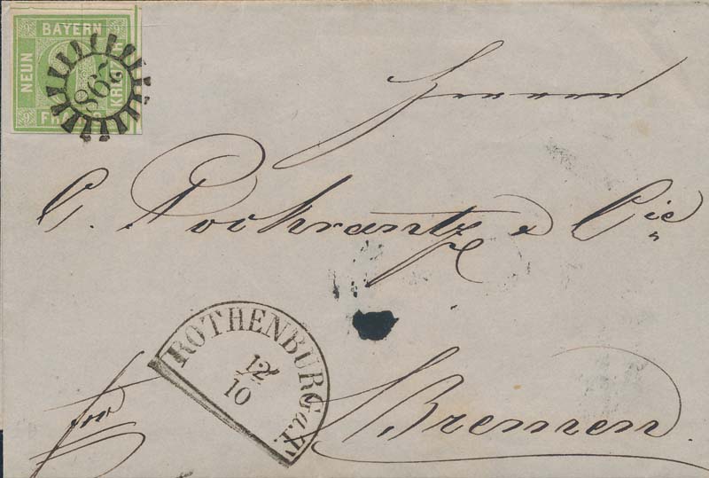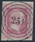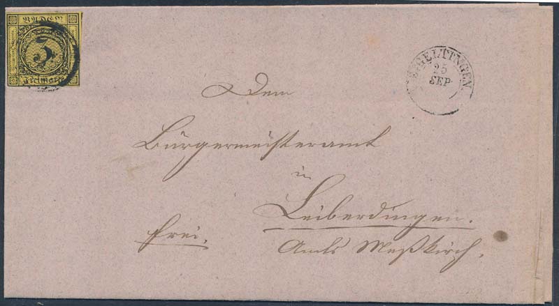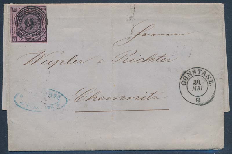 9 Kr. Ziffer Ausg. 1851 "b"-Farbe 3seitig breit bis überrandig, nur r. mini Randlinienschnitt als EF auf Bf. mit Nr.-Stpl. "25" u. nebenges. K2 "CONSTANZ" nach Chemnitz |