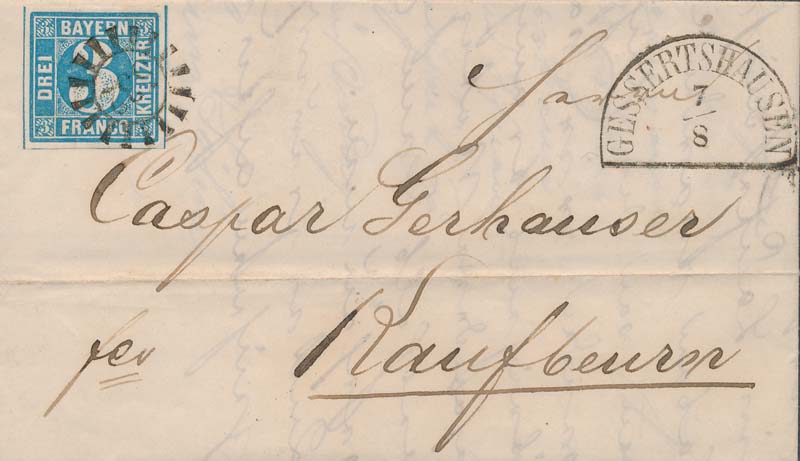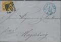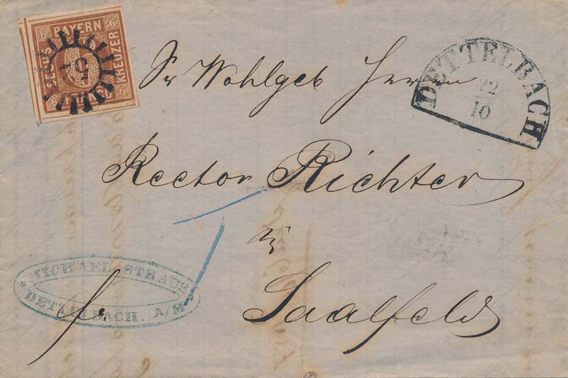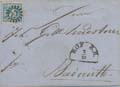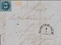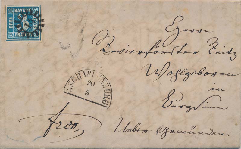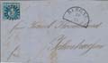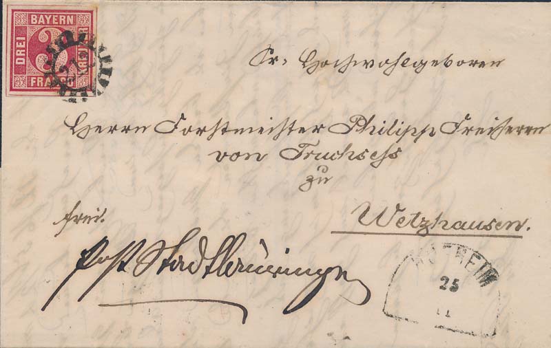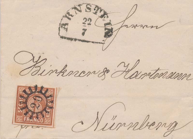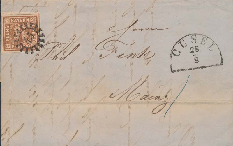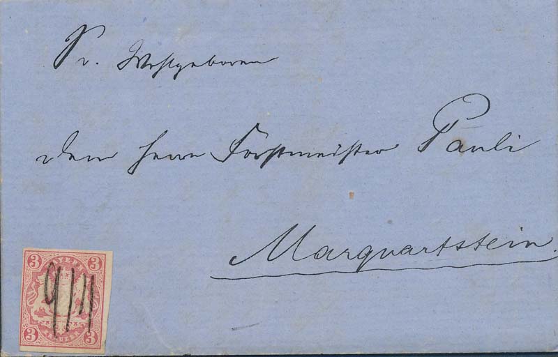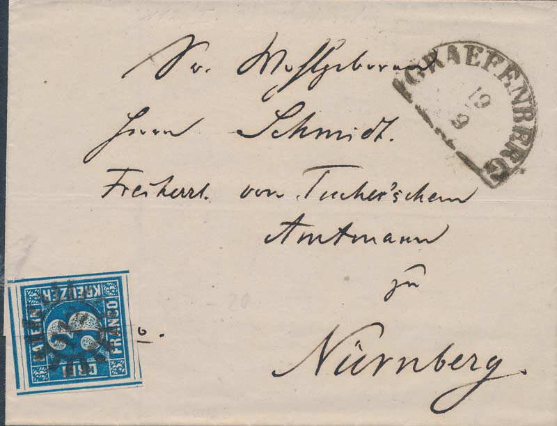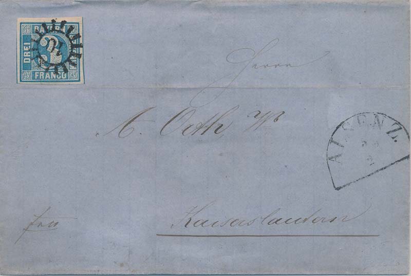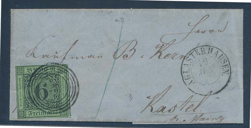 6 Kr. Ziffer Ausg. 1851 "b"-Farbe 3seitig breit bis überrandig, nur l. Randlinienschnitt als EF auf Bf. mit Nr.-Stpl. "4" u. nebenges. K2 "AGLASTERHAUSEN" nach Kastel |