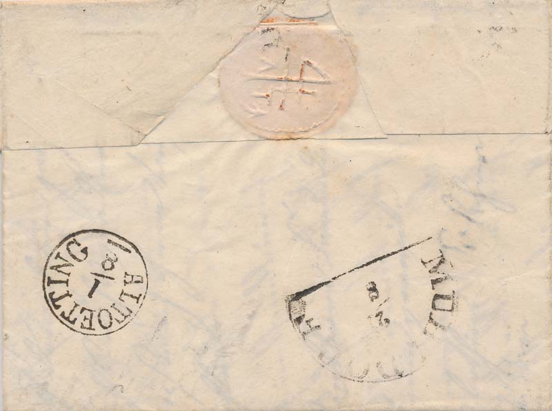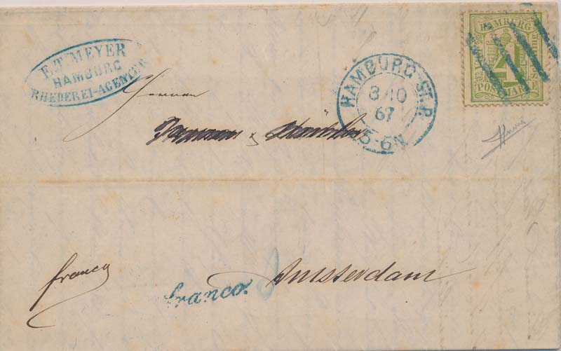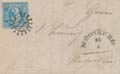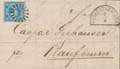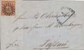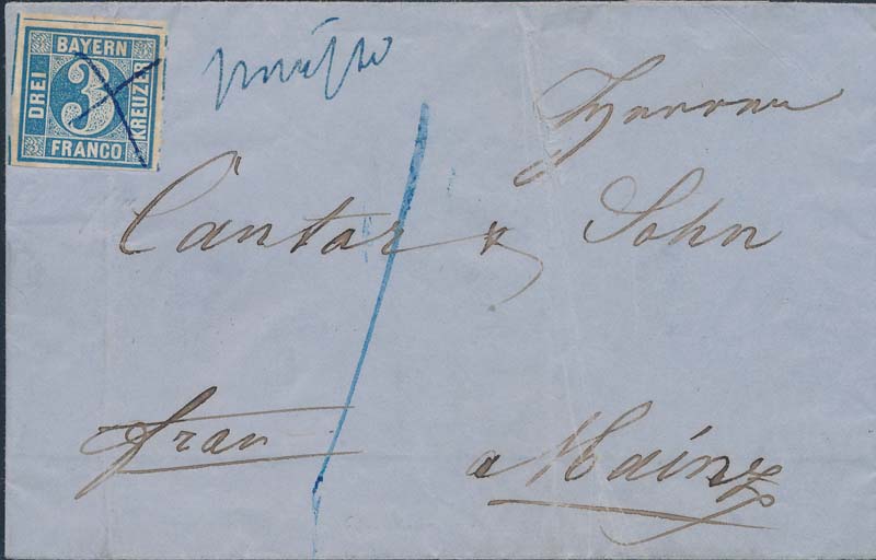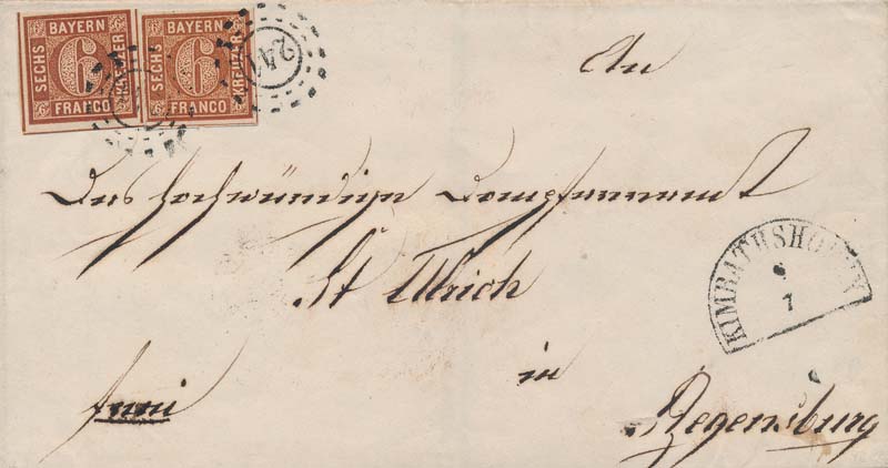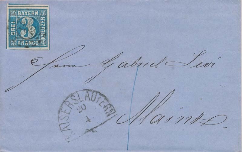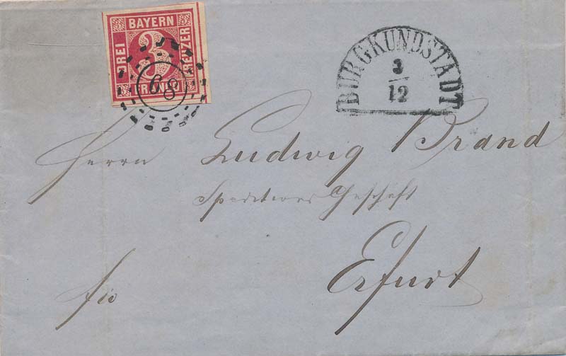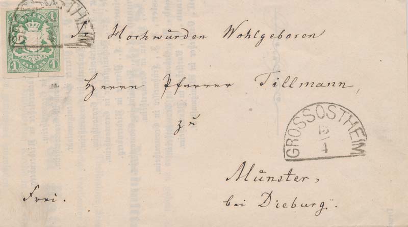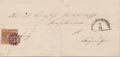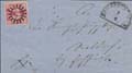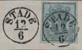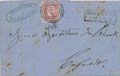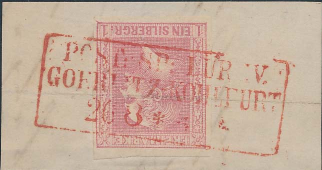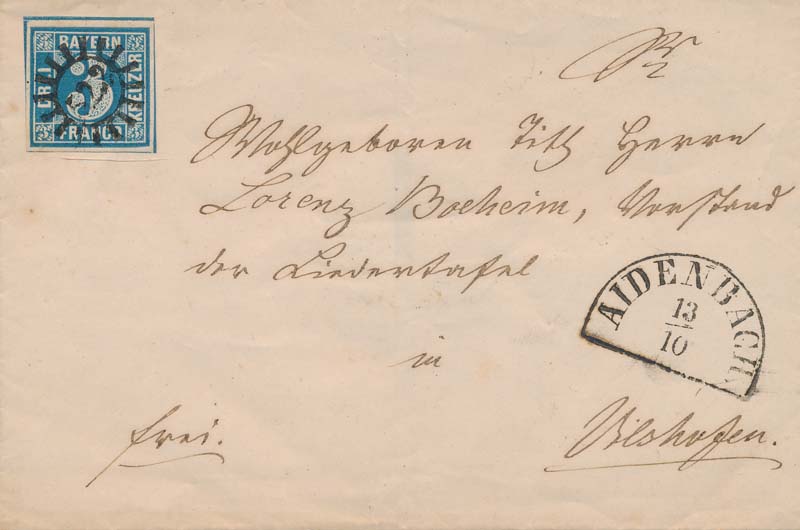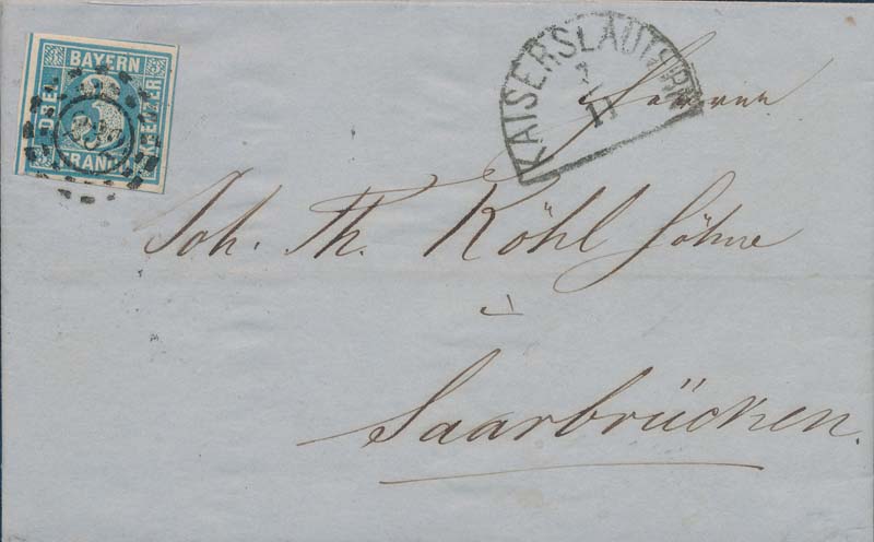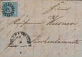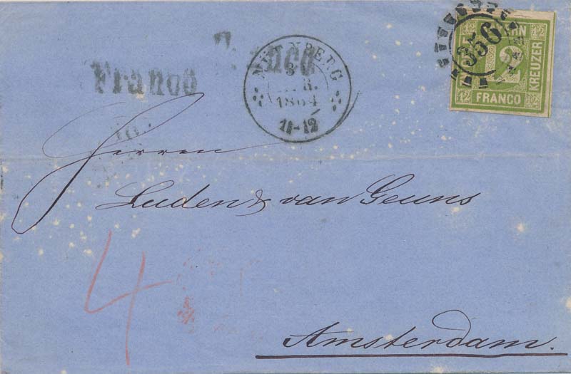6 Kr. Ziffer Ausg. 1851 "b"-Farbe 3seitig breit bis überrandig, nur l. Randlinienschnitt als EF auf Bf. mit Nr.-Stpl. "4" u. nebenges. K2 "AGLASTERHAUSEN" nach Kastel |