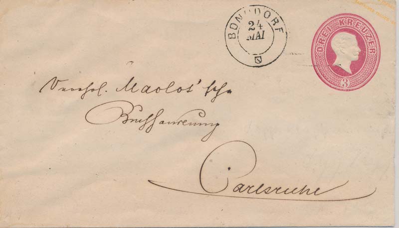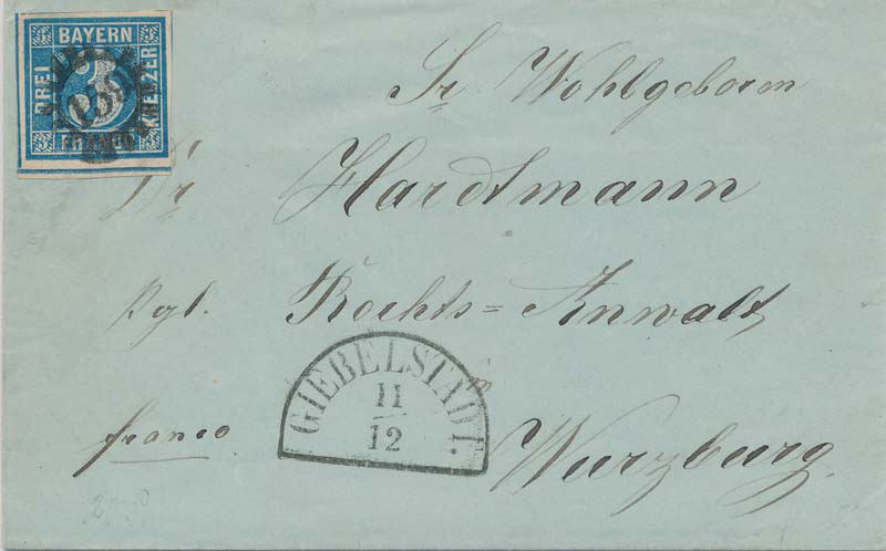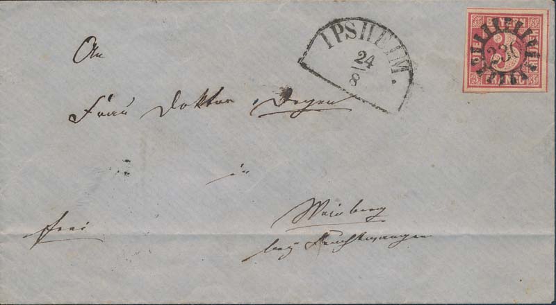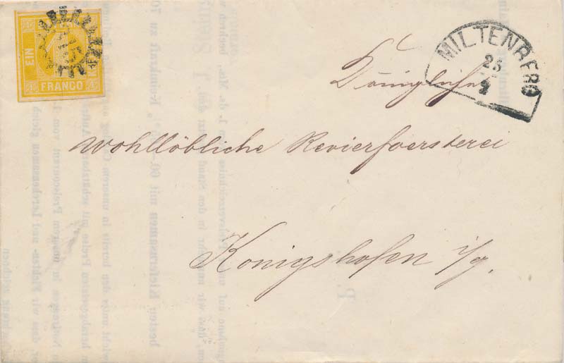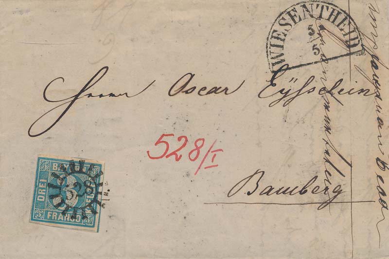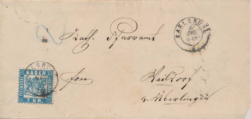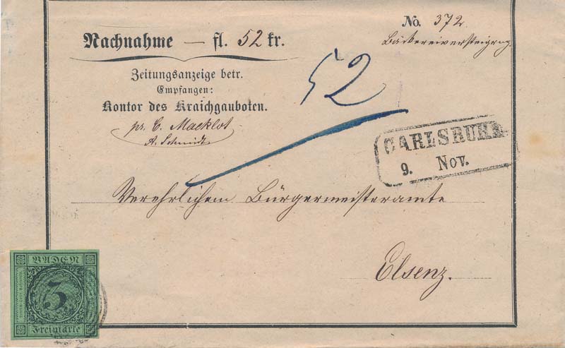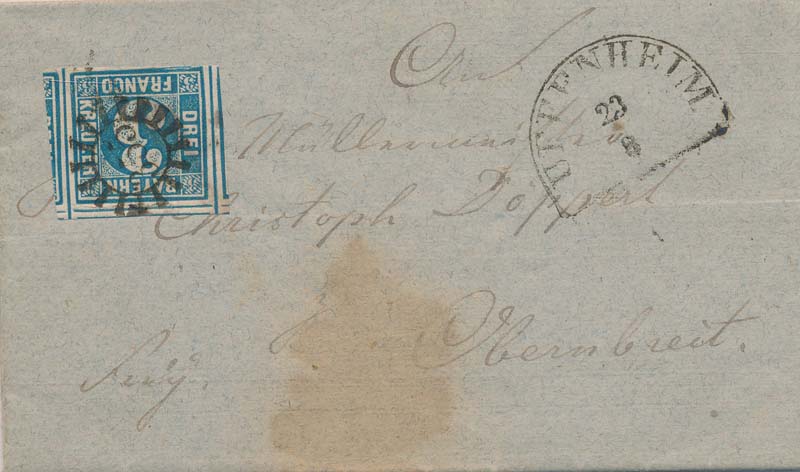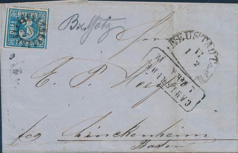 3 Kr. Ziffer Ausg. 1853 allseits breitrandig als EF auf NN-Bf. mit Nr.-Stpl. "24" u. nebenges. Ra2 "CARLSRUHE" nach Elsenz gepr. Stegmüller |