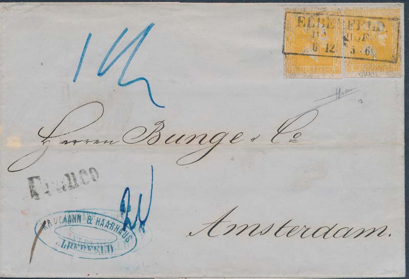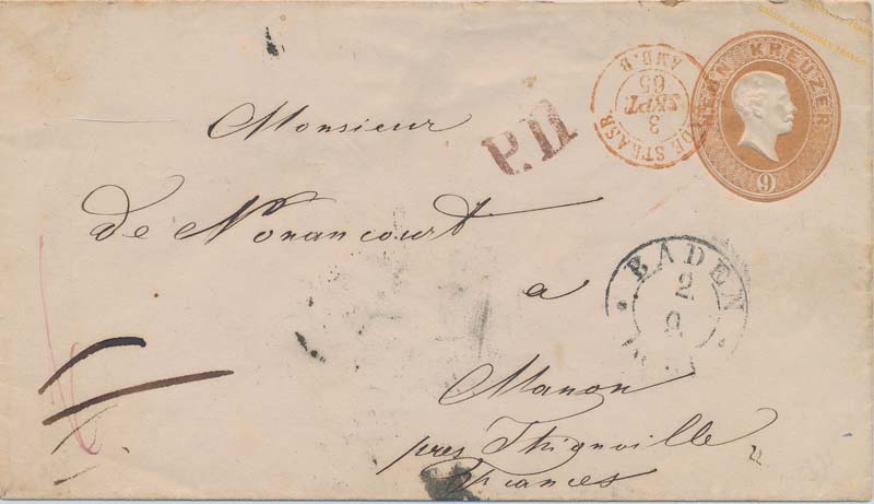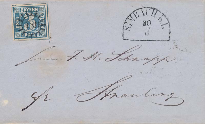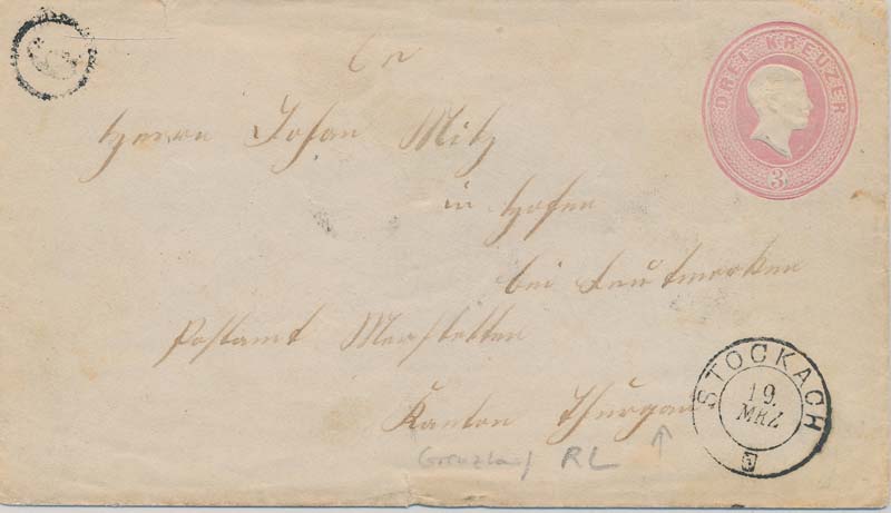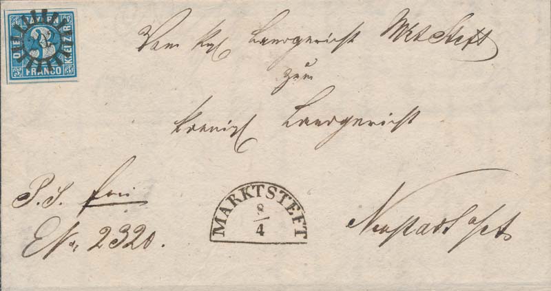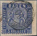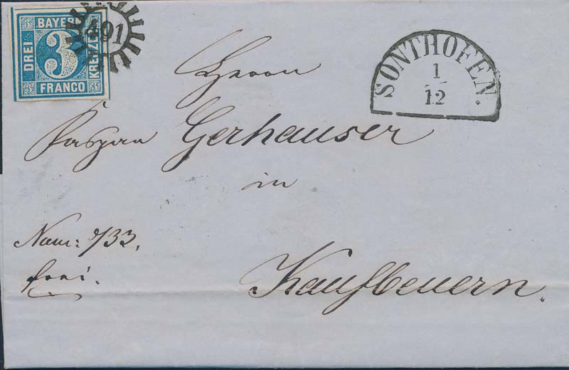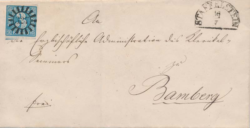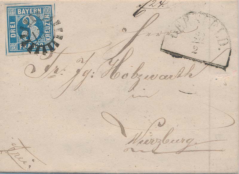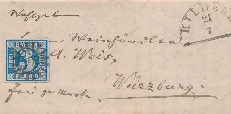 3 Kr. Ziffer Ausg. 1853 allseits breitrandig als EF auf NN-Bf. mit Nr.-Stpl. "24" u. nebenges. Ra2 "CARLSRUHE" nach Elsenz gepr. Stegmüller |