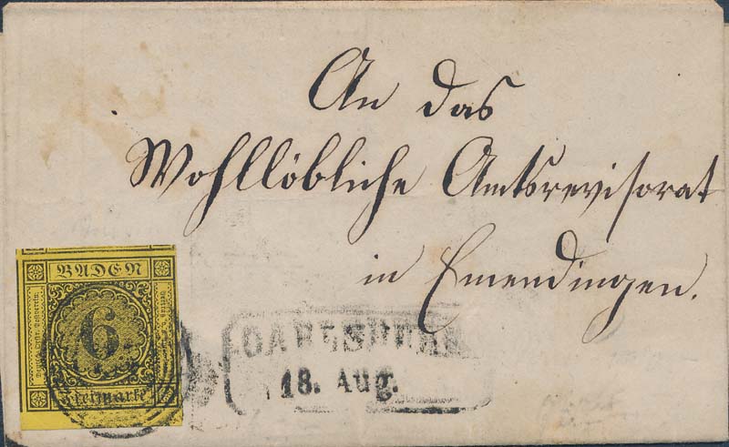 6 Kr. Ziffer Ausg. 1853 allseits voll bis breitrandig mit 3 Nachbarmarken u. kl. Unterrand als EF auf Bf. mit Nr.-Stpl. "24" u. nebenges. Ra2 "CARLSRUHE" nach Emmendingen |
