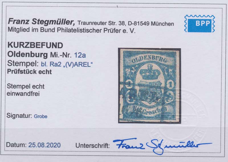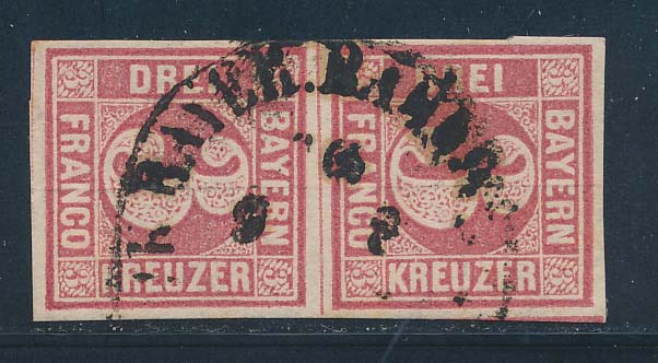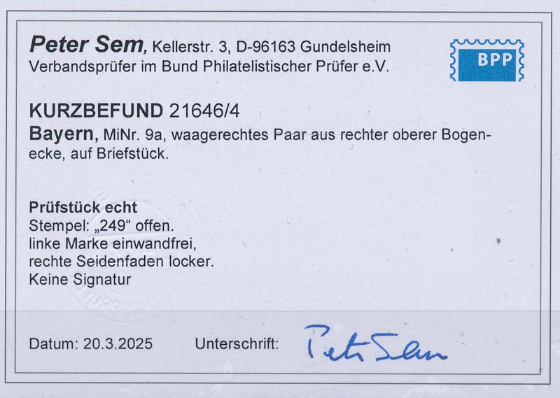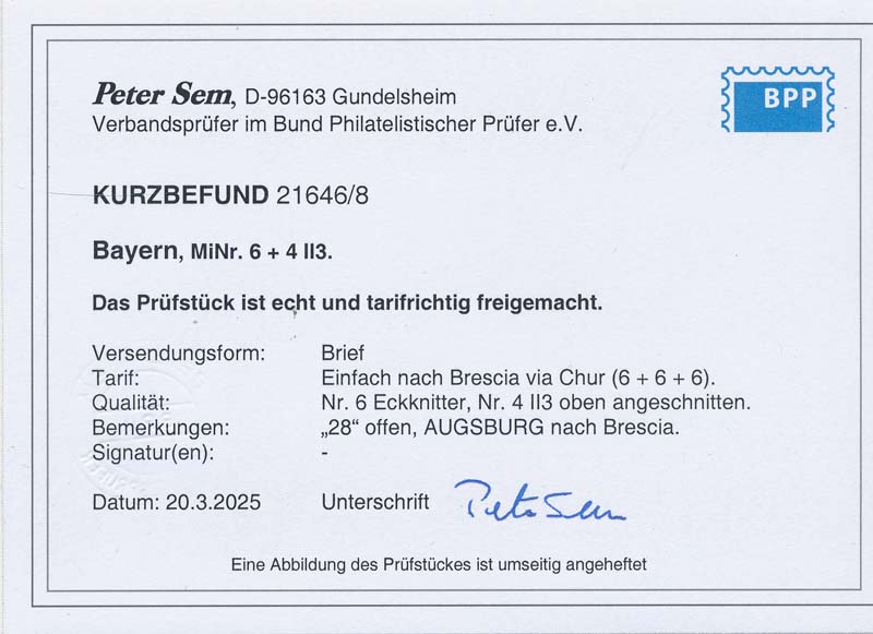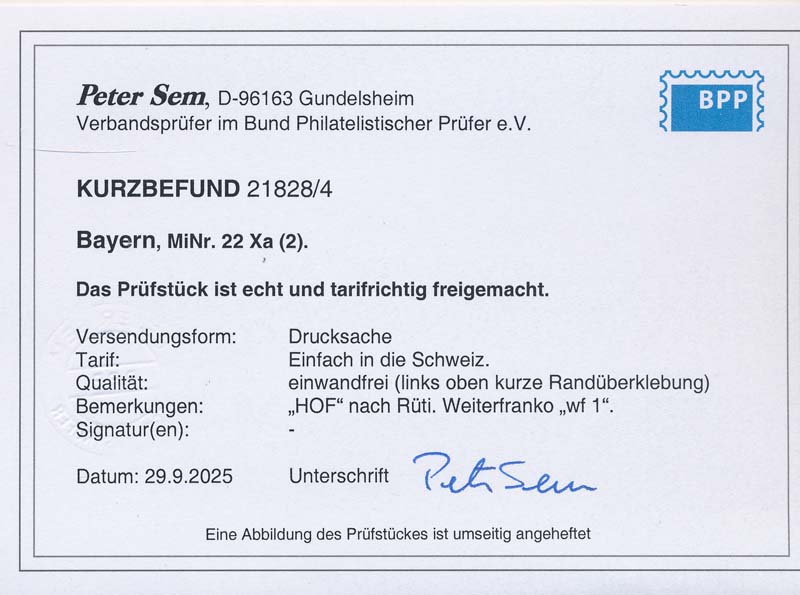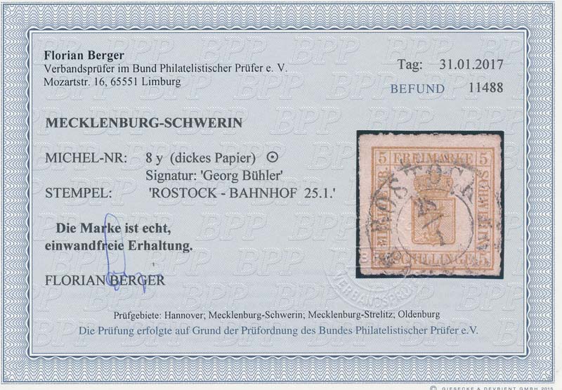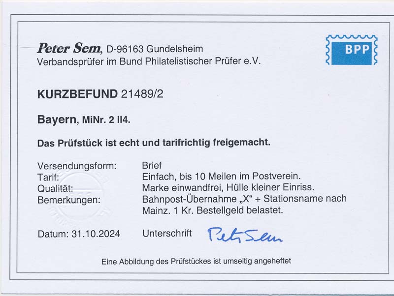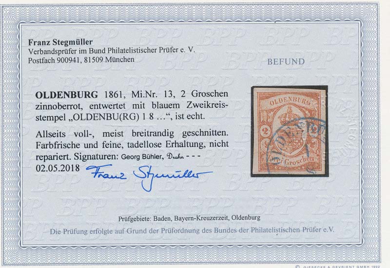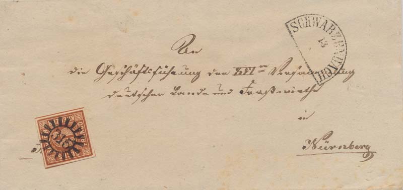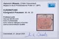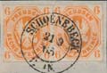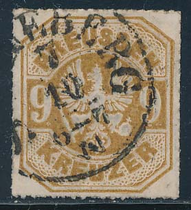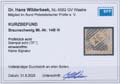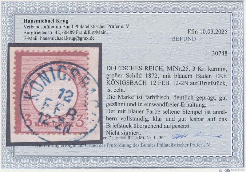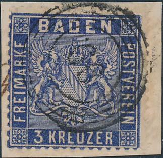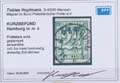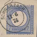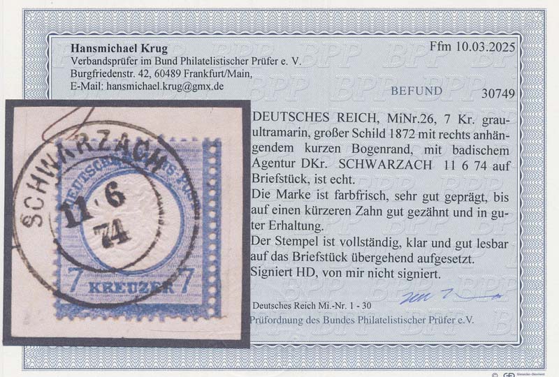 "SCHWARZACH" badischer Agentur K2 ideal auf Bf.-St. mit DR 7 Kr. gr. Schild (mit kl. r. Bogenrand) neuer Befund Krug "echt u. bis auf 1 kürzeren Zahn in guter Erhaltung" |