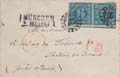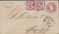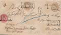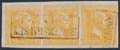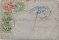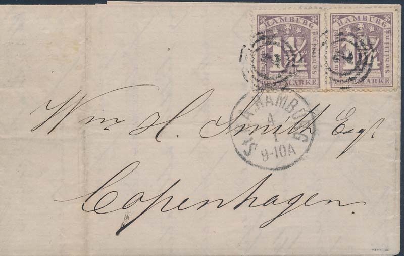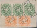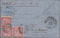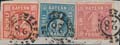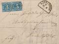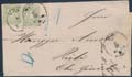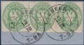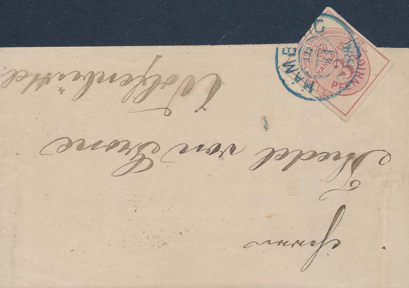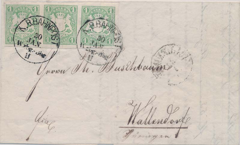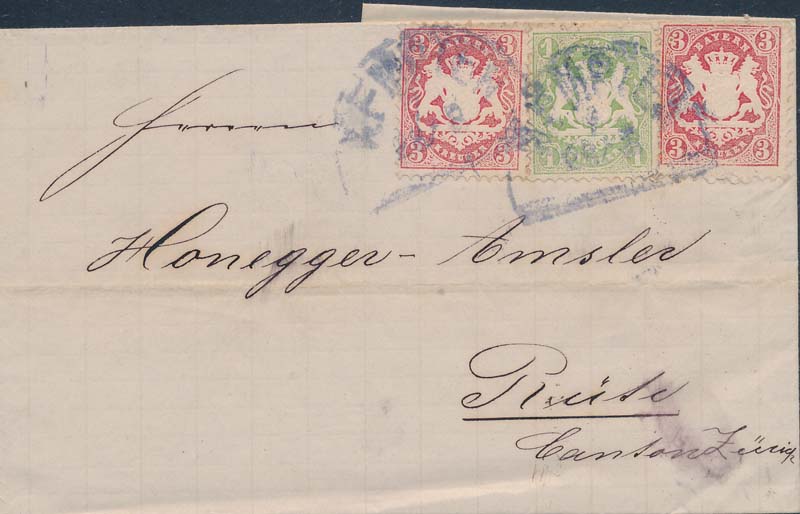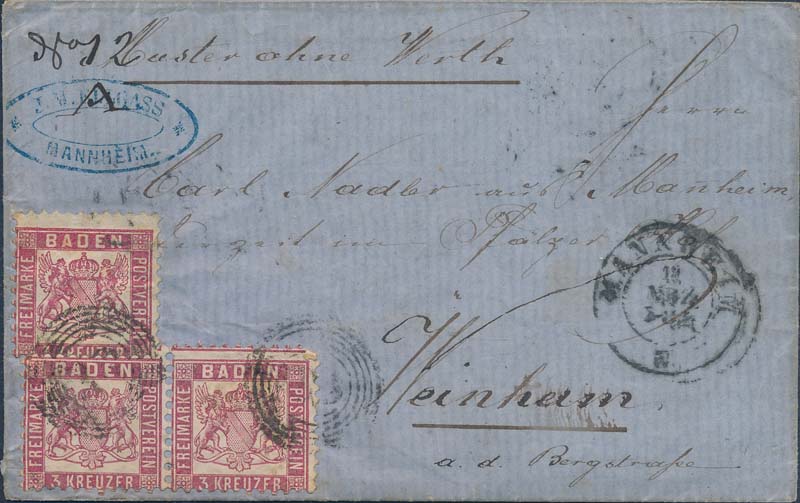 3 Kr. Wappen Ausg. 1862 weit gez. als MeF von 3 St. (dabei ) auf Bf. "Muster ohne Werth" mit Nr.-Stpl. "87" u. nebenges. K2 "MANNHEIM" nach Weinheim |