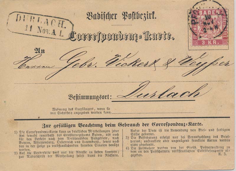 3 Kr. Wappen Ausg. 1868 als EF auf Correspondenz-Karte ab Pforzheim nach Durlach, Karte übl. Faltbug |