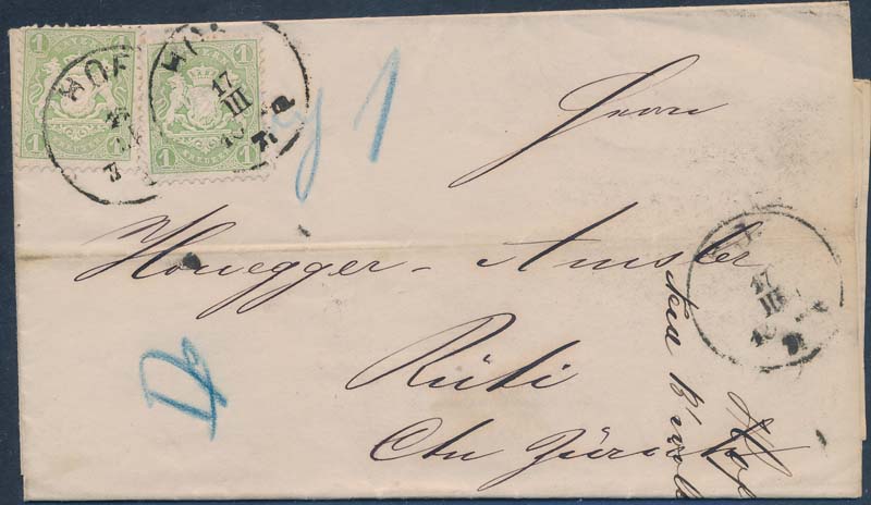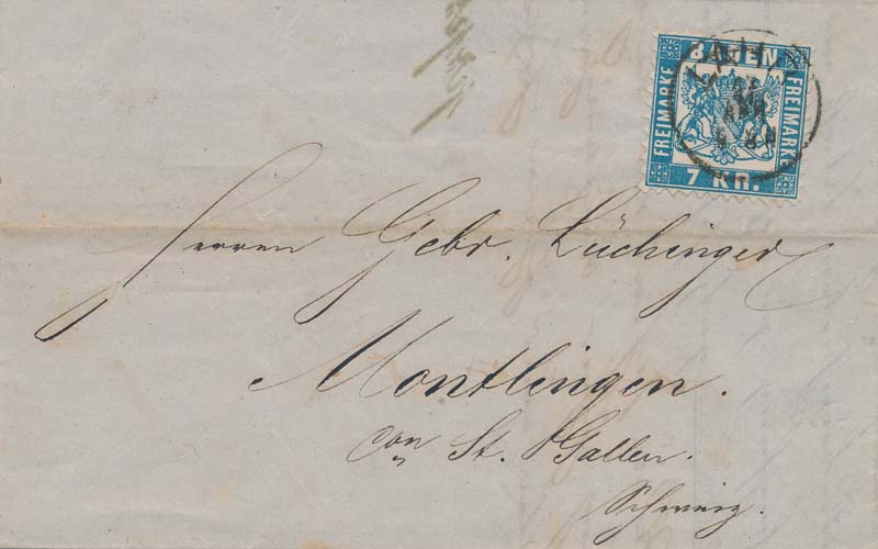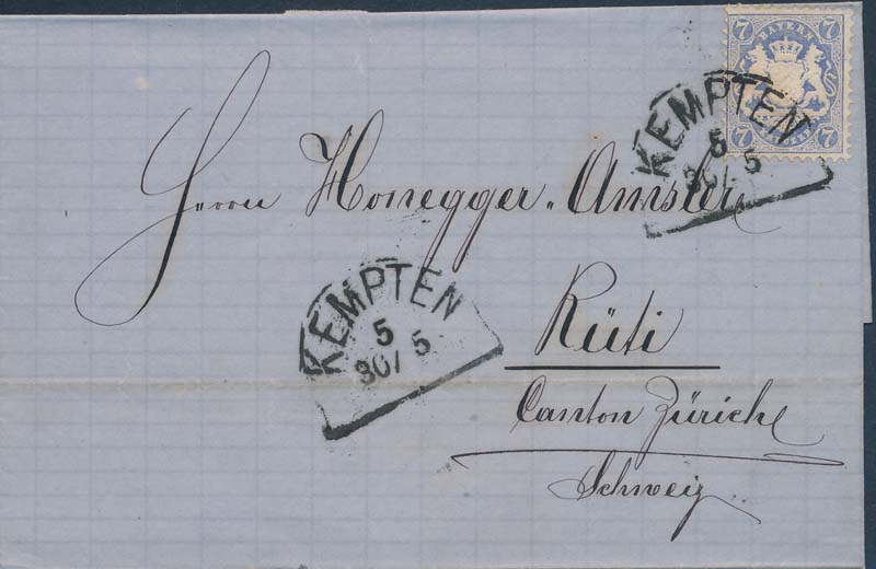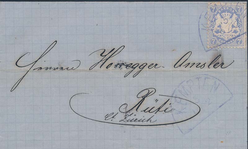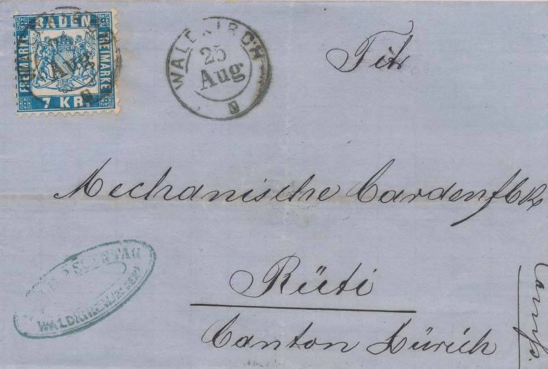 7 Kr. Wappen Ausg. 1868 als EF auf Auslandsbf. ab Waldkirch (K2) vom 25.8.(69) in die Schweiz |
