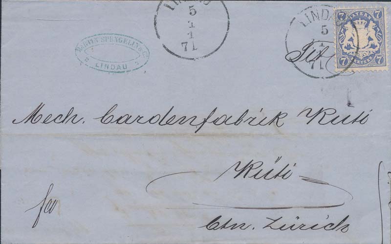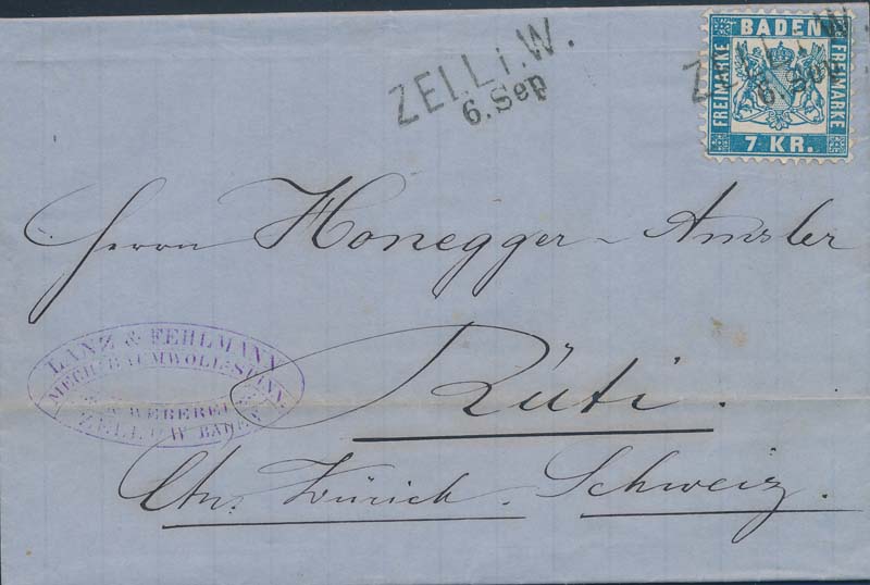 7 Kr. Wappen Ausg. 1868 mit Plattenfehler II als EF auf Auslandsbf. ab Zell i.W. (L2) vom 6.9.(71) in die Schweiz |