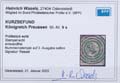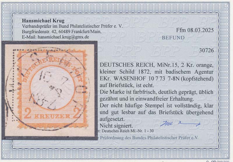 "WASENHOF" badischer Agentur K1 ideal auf Bf.-St. mit DR 2 Kr. gr. Schild orange neuer Befund Krug "echt u. einwandfrei" |