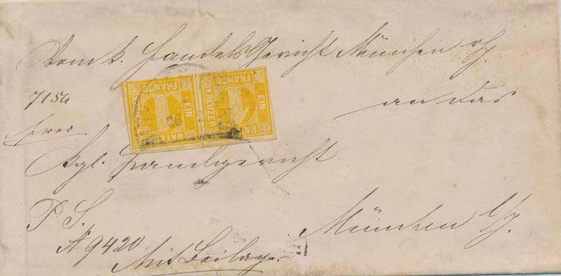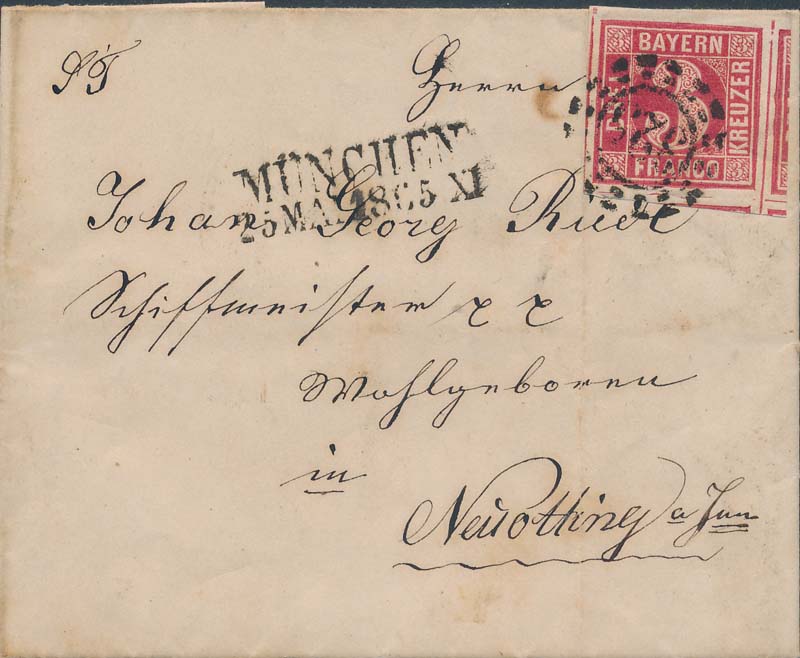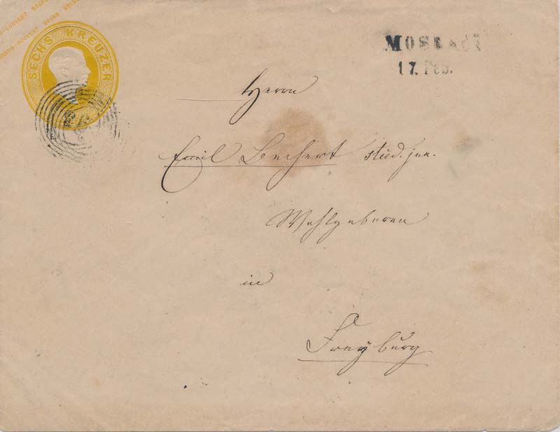 6 Kr. Ausg. 1858 "B"-Format gebr. mit Nr.-Stpl. "93" u. nebenges. L2 "MOSBACH" nach Freiburg, Umschlag mini Randspuren |