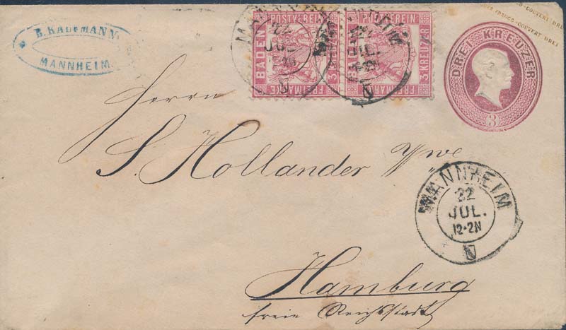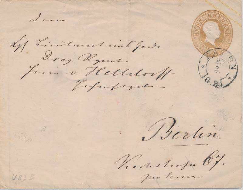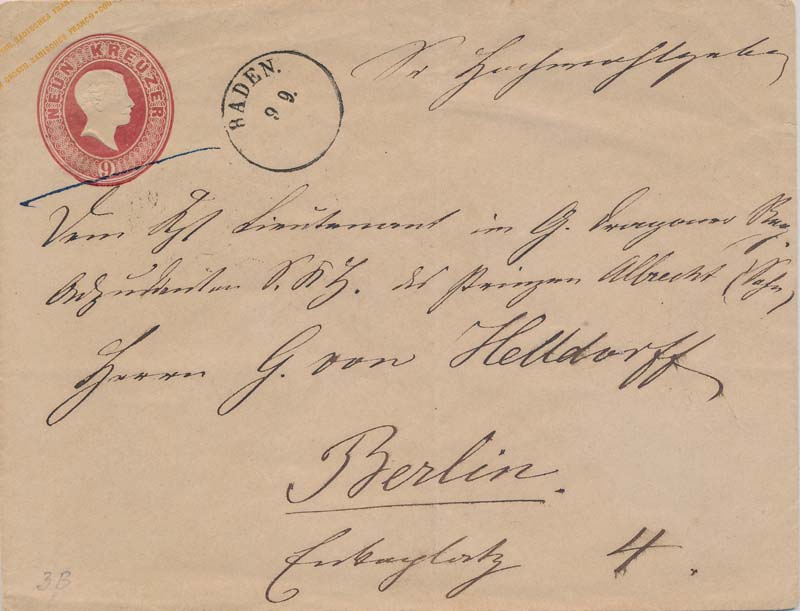 9 Kr. Ausg. 1863 "B"-Format gebr. ab Baden (K2) nach Berlin, Umschlag leichter Faltbug u. leichte Randspuren |