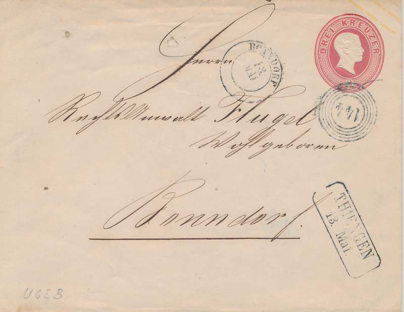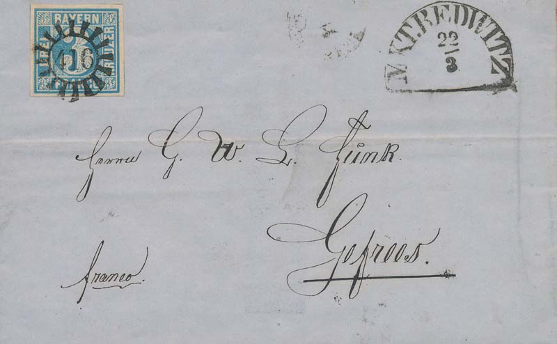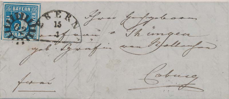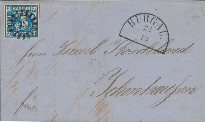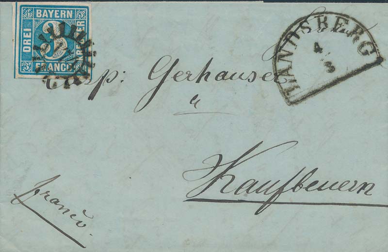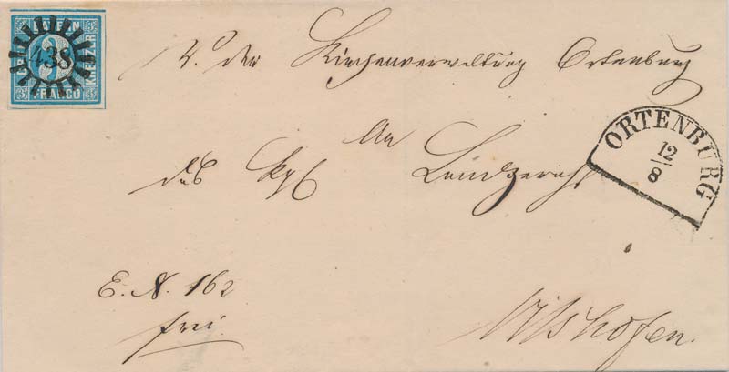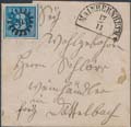 3 Kr. Ausg. 1862 "B"-Format gebr. mit Nr.-Stpl. "144" u. nebenges. Ra2 "THIENGEN" nach Bonndorf |