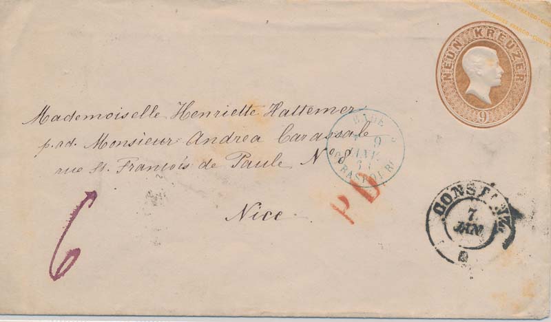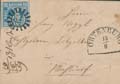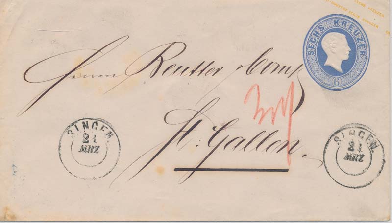 6 Kr. Ausg. 1862 Typ II gebr. als Auslandsbf. ab Singen (K2) in die Schweiz, leichte Alterspatina |