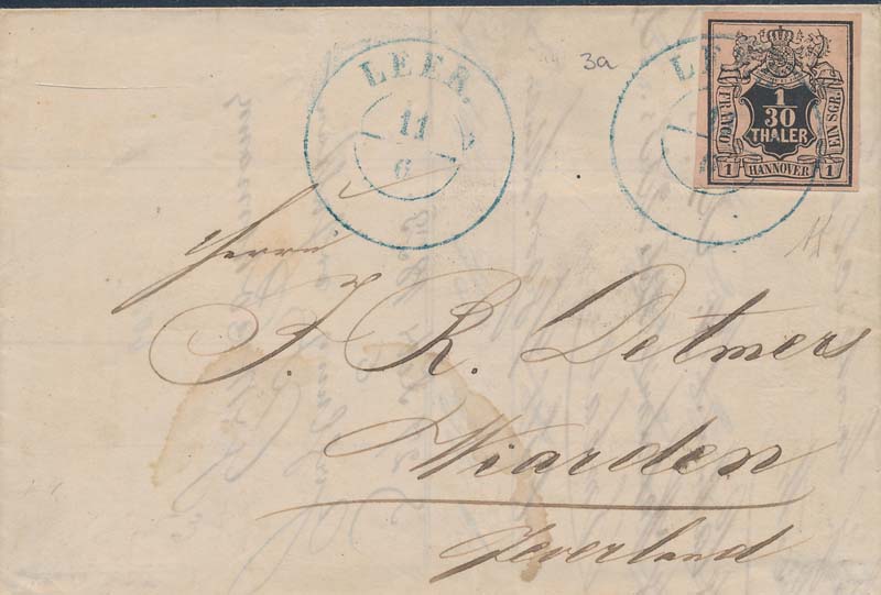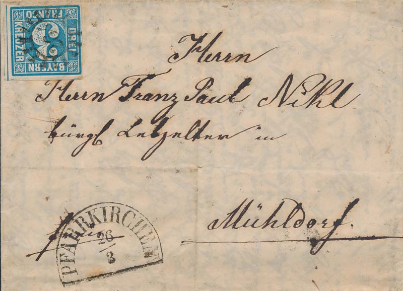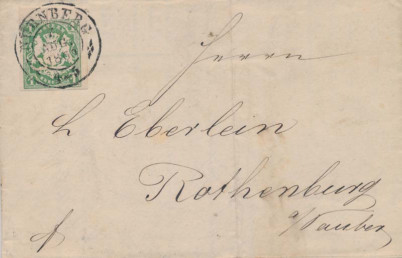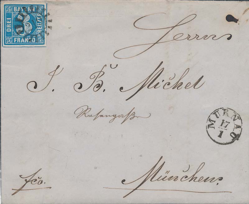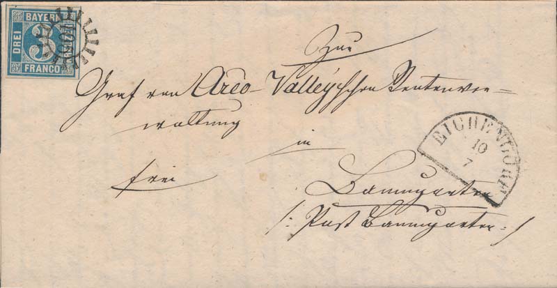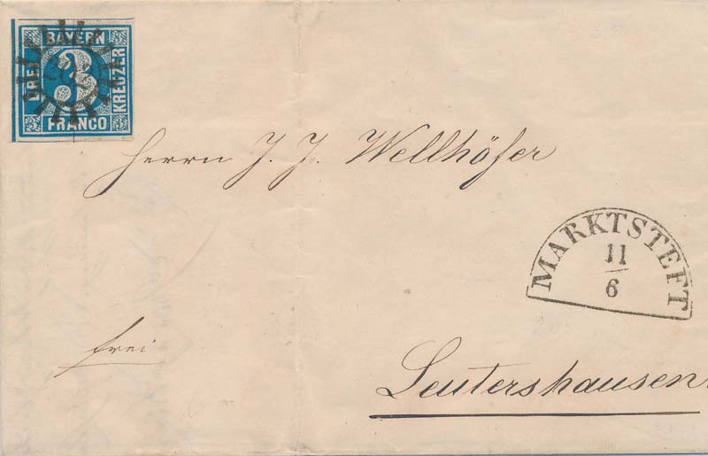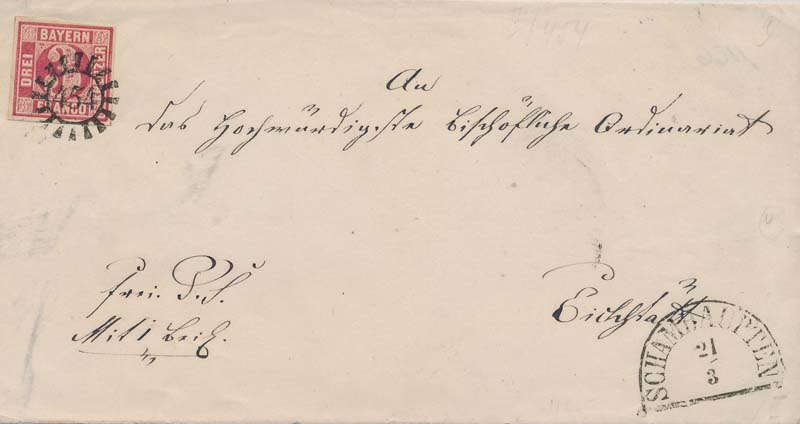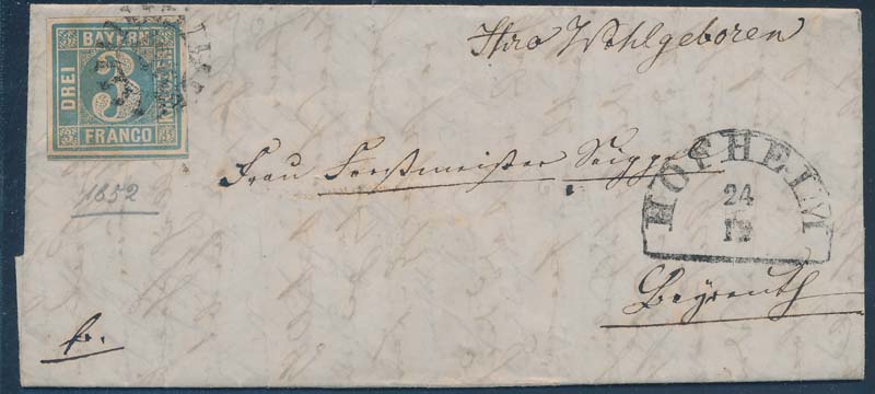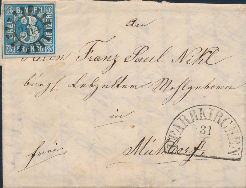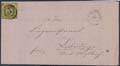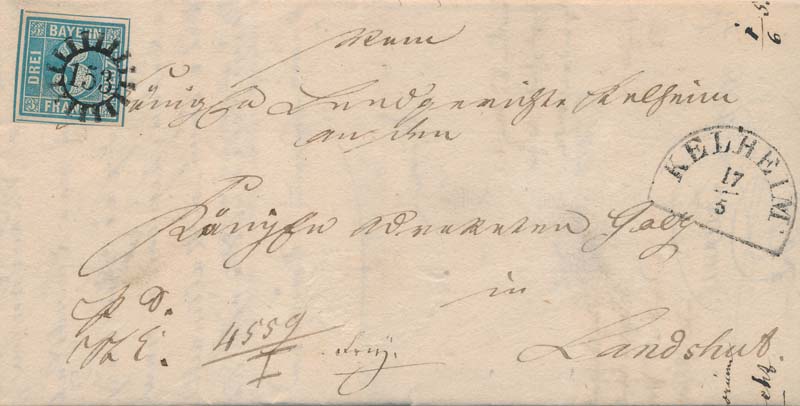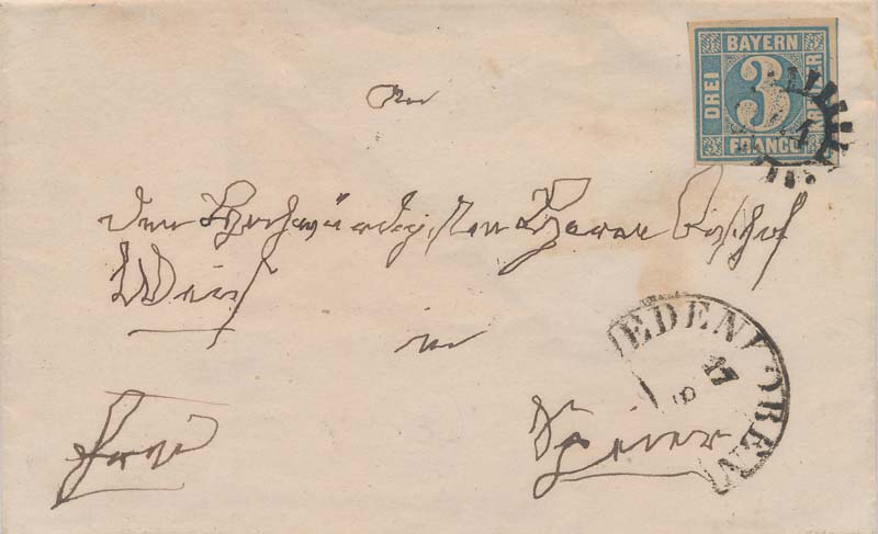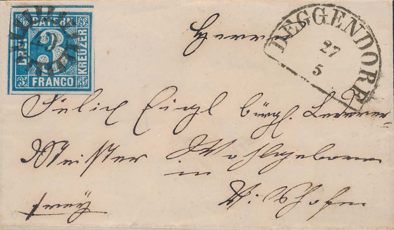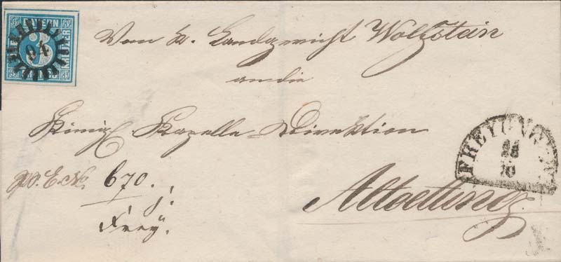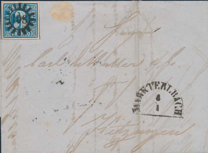 3 Kr. Ziffer Ausg. 1851 "a"-Farbe teils Randlinienschnitt als EF auf Bf. mit Nr.-Stpl. "34" u. nebenges. K2 "EIGELTINGEN" nach Meßkirch |