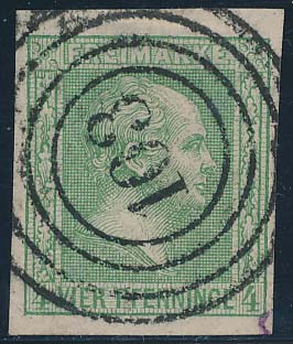 "394" zentrisch glasklar auf voll bis breitrandiger ½ Sgr. Ausg. 1850 |