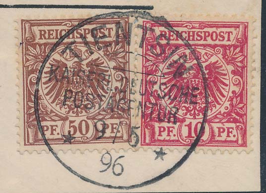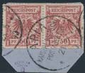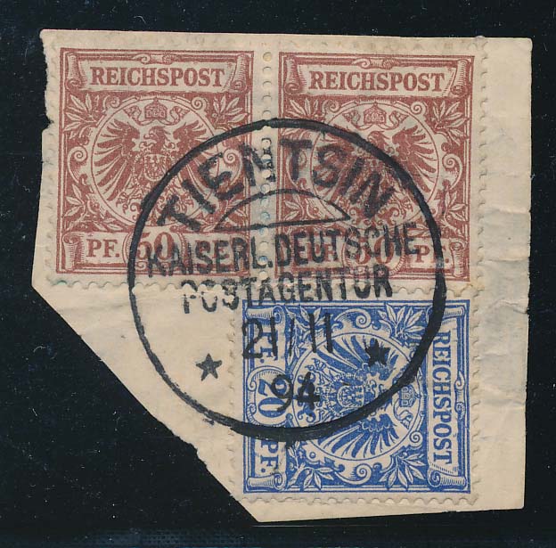 Vorläufer 20 Pf. Krone-Adler "d"-Farbe u. 50 Pf. "c"-Farbe zusammen auf Bf.-St. zentrisch gestpl. "TIENTSIN" 1 mal 50 Pf. Aufklebefalte gepr. Jäschke-L. |