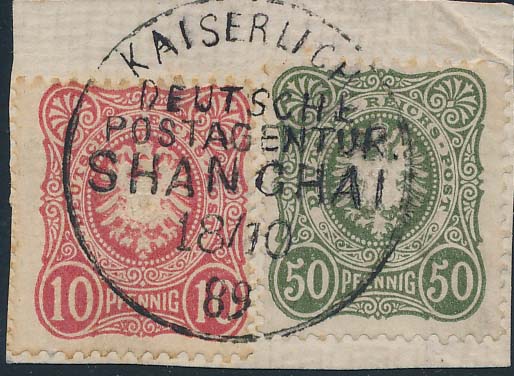 Vorläufer 10 u. 50 Pf. zusammen auf Bf.-St. mit glasklaren Stpl. "K.D.P. SHANGHAI" vom 18.10.89 |