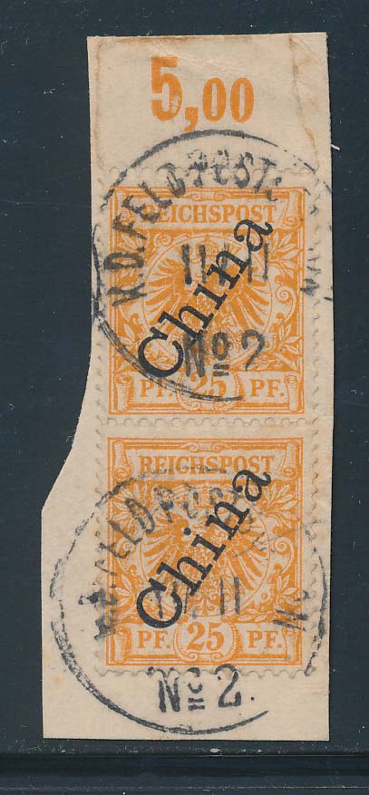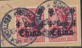 Vorläufer 10 u. 50 Pf. Krone-Adler je "d"-Farbe zusammen auf Bf.-St. zentrisch gestpl. "TIENTSIN" Pracht gepr. Jäschke-L. |