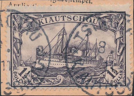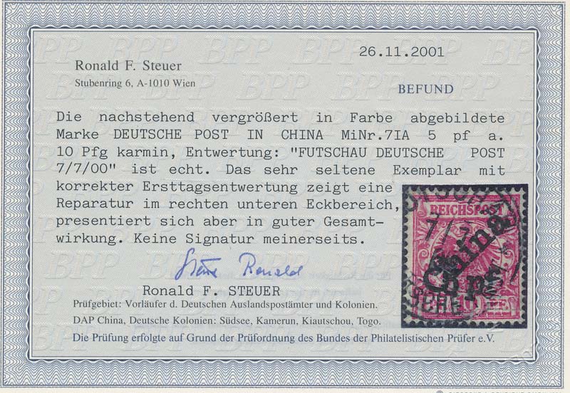 5 pf. a. 10 Pf. Krone-Adler mit diagonalem Aufdruck sogen. Futschau-Provisorium mit zentrischen Stpl. "FUTSCHAU" vom 7.7.00 (Ersttag!) Eckreperatur aber eine sehr seltene Marke mit Ersttagsstpl.! Befund Steuer |